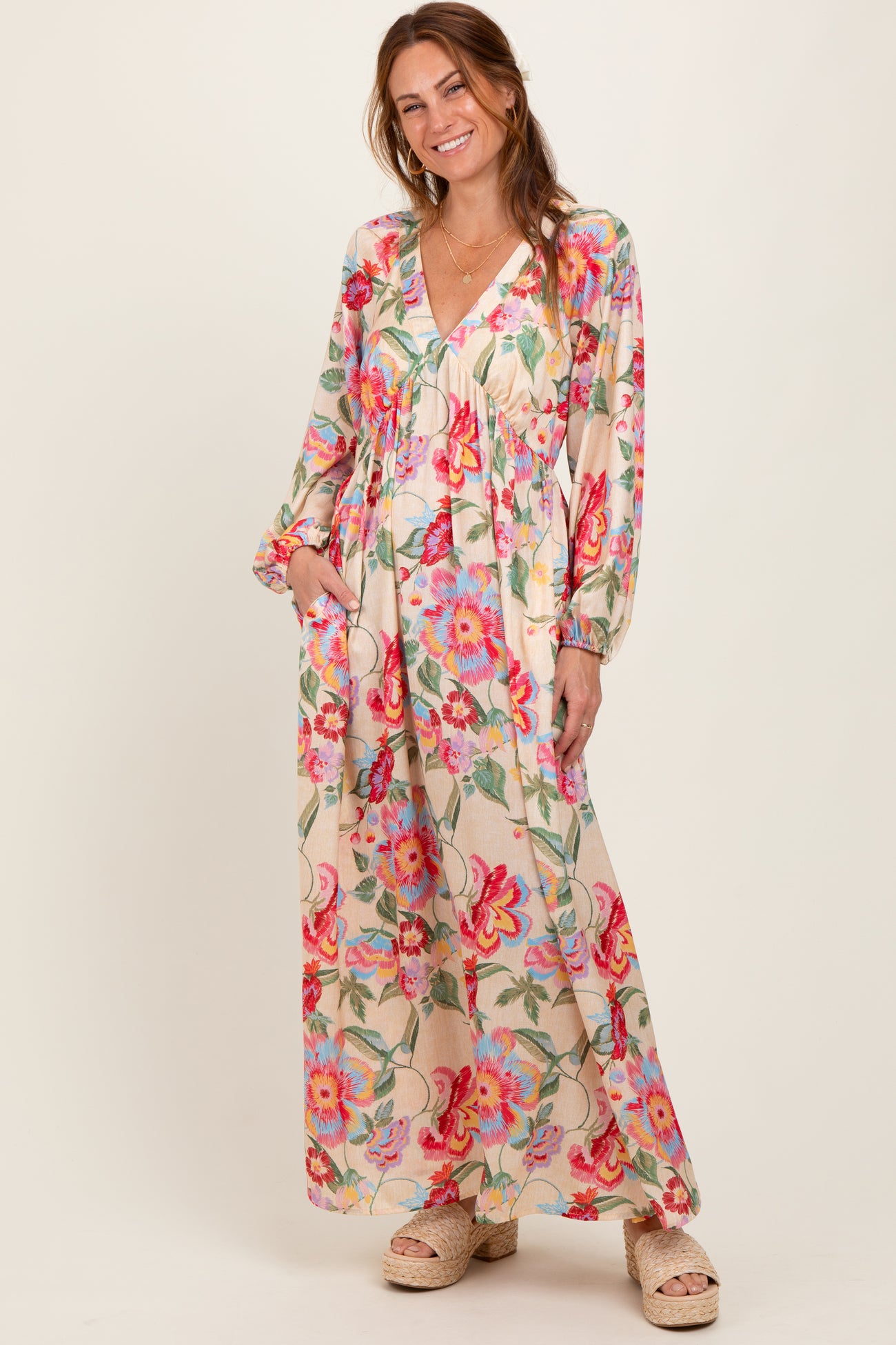 Beige Floral V-Neck Long Sleeve Maxi Dress