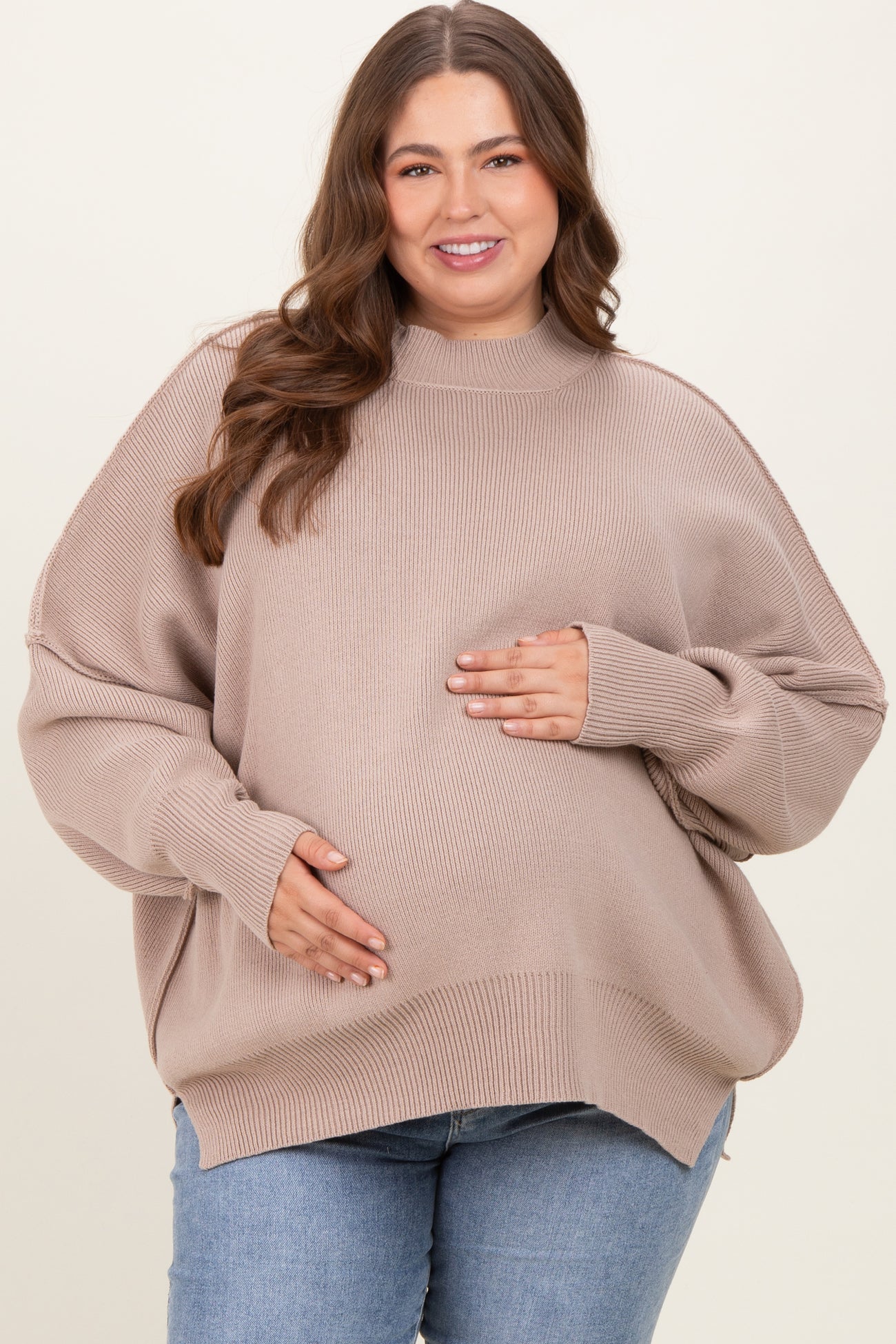 Beige Mock Neck Exposed Seam Maternity Sweater