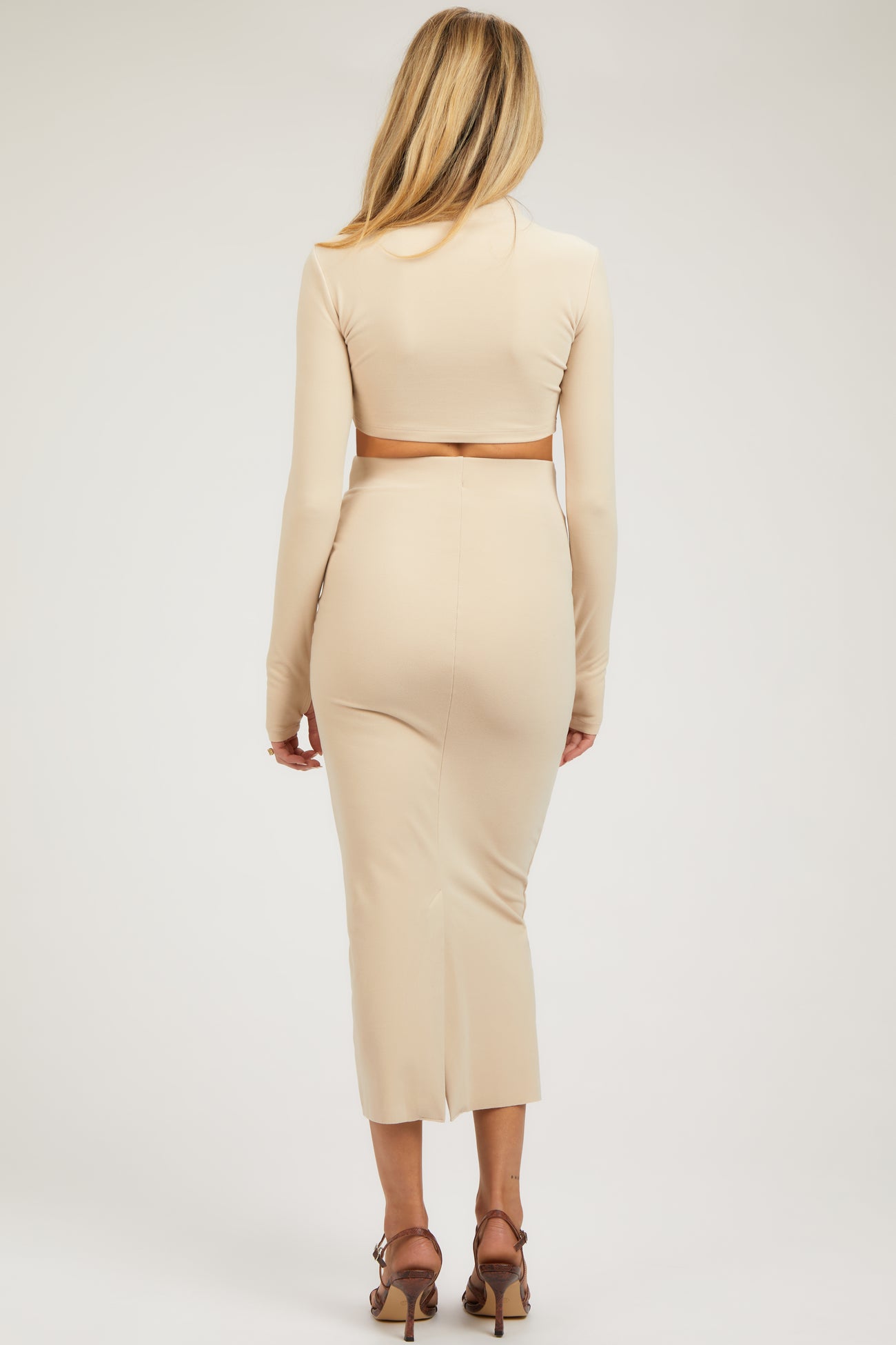 Beige Mock Neck Long Sleeve Crop Maternity Midi Skirt Set
