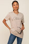 A short sleeve basic crewneck tee with a graphic detail in front.