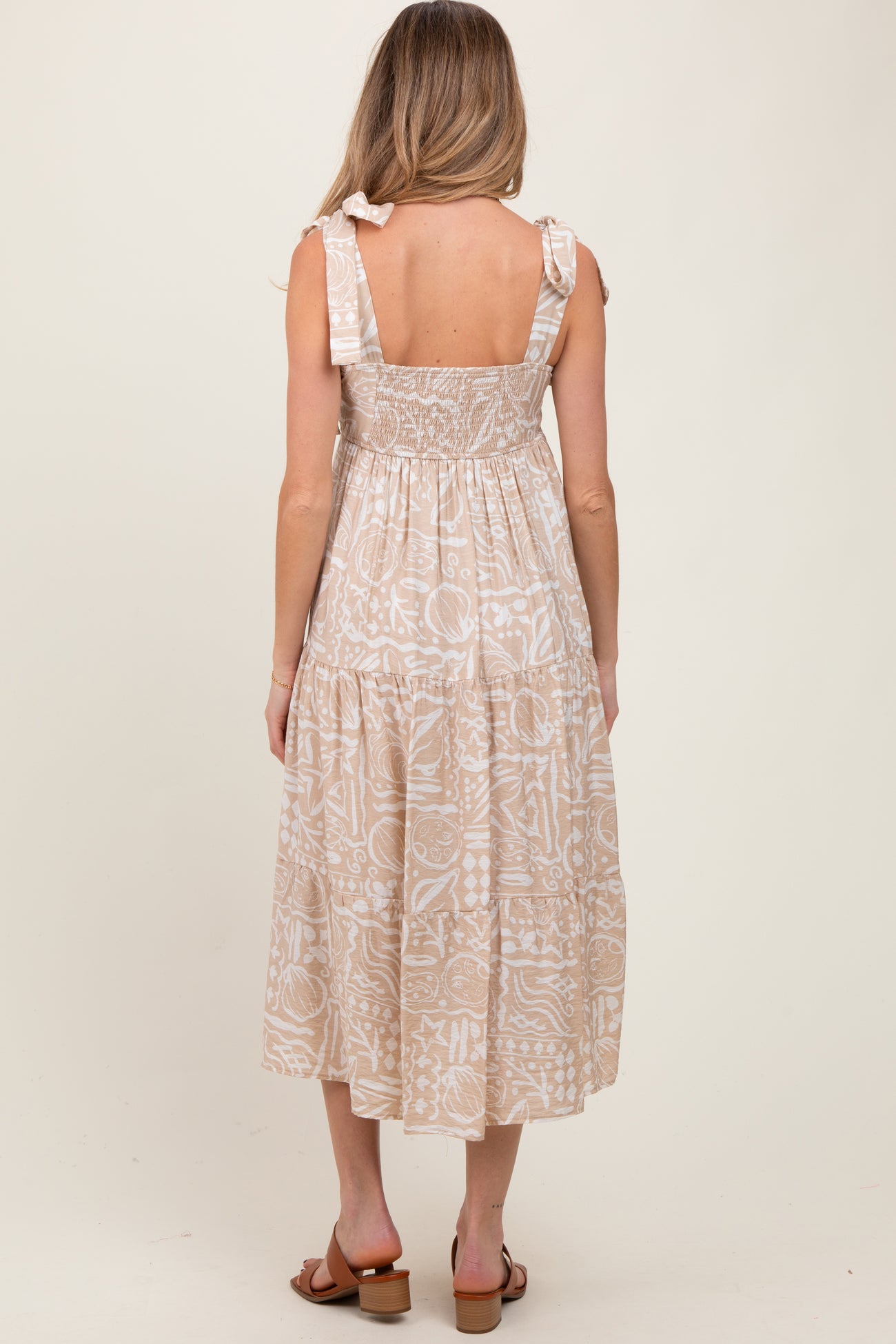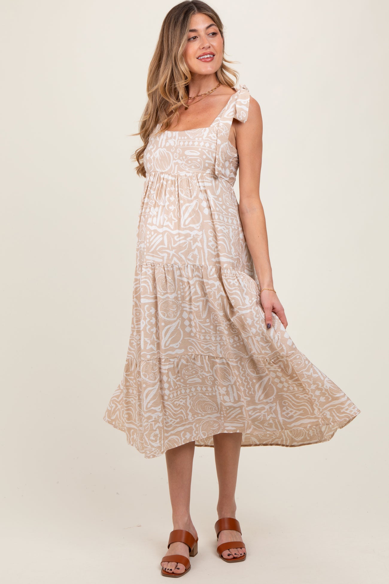 Beige Printed Tie Strap Tiered Maternity Midi Dress