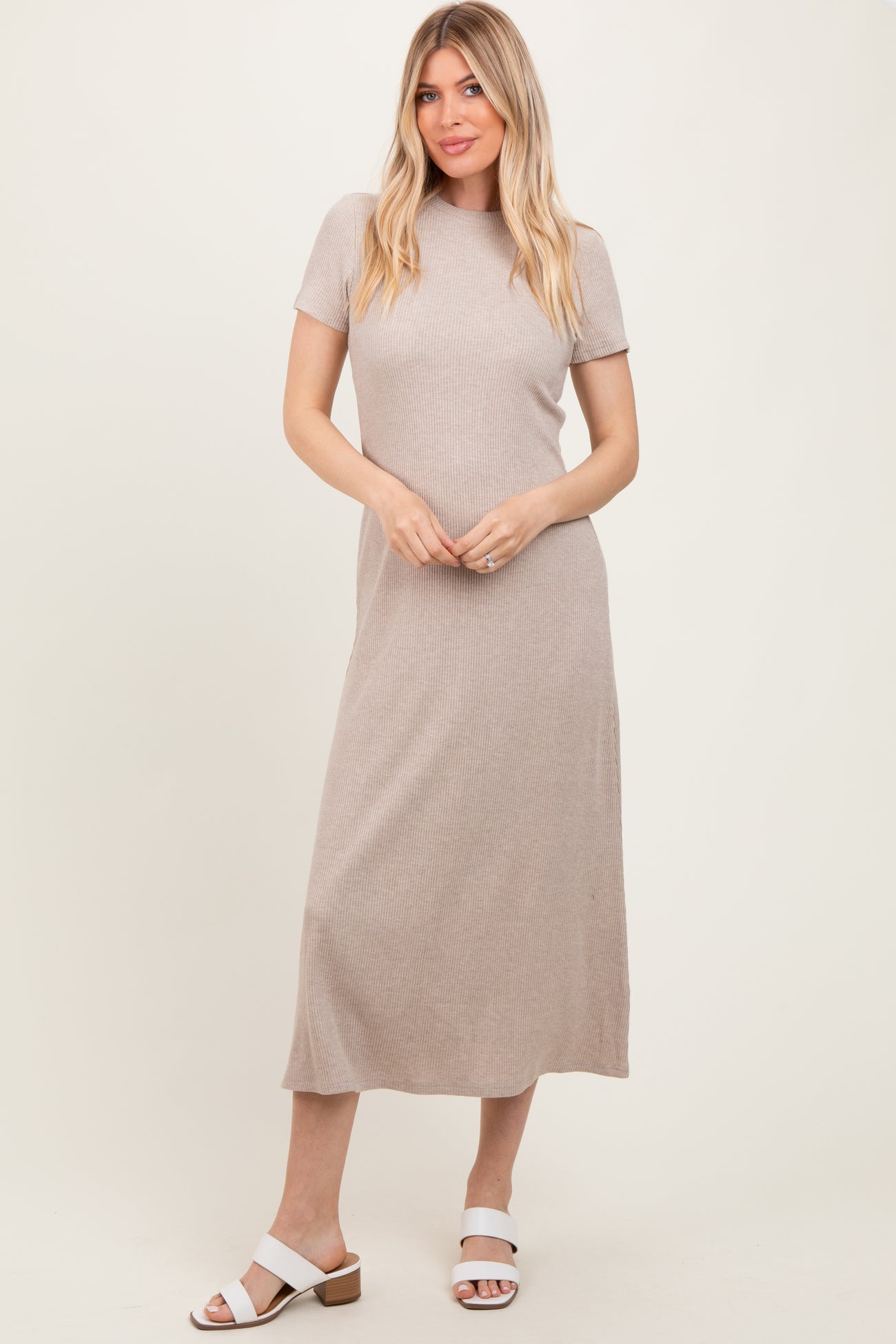 Beige Ribbed Short Sleeve Maternity Midi Dress