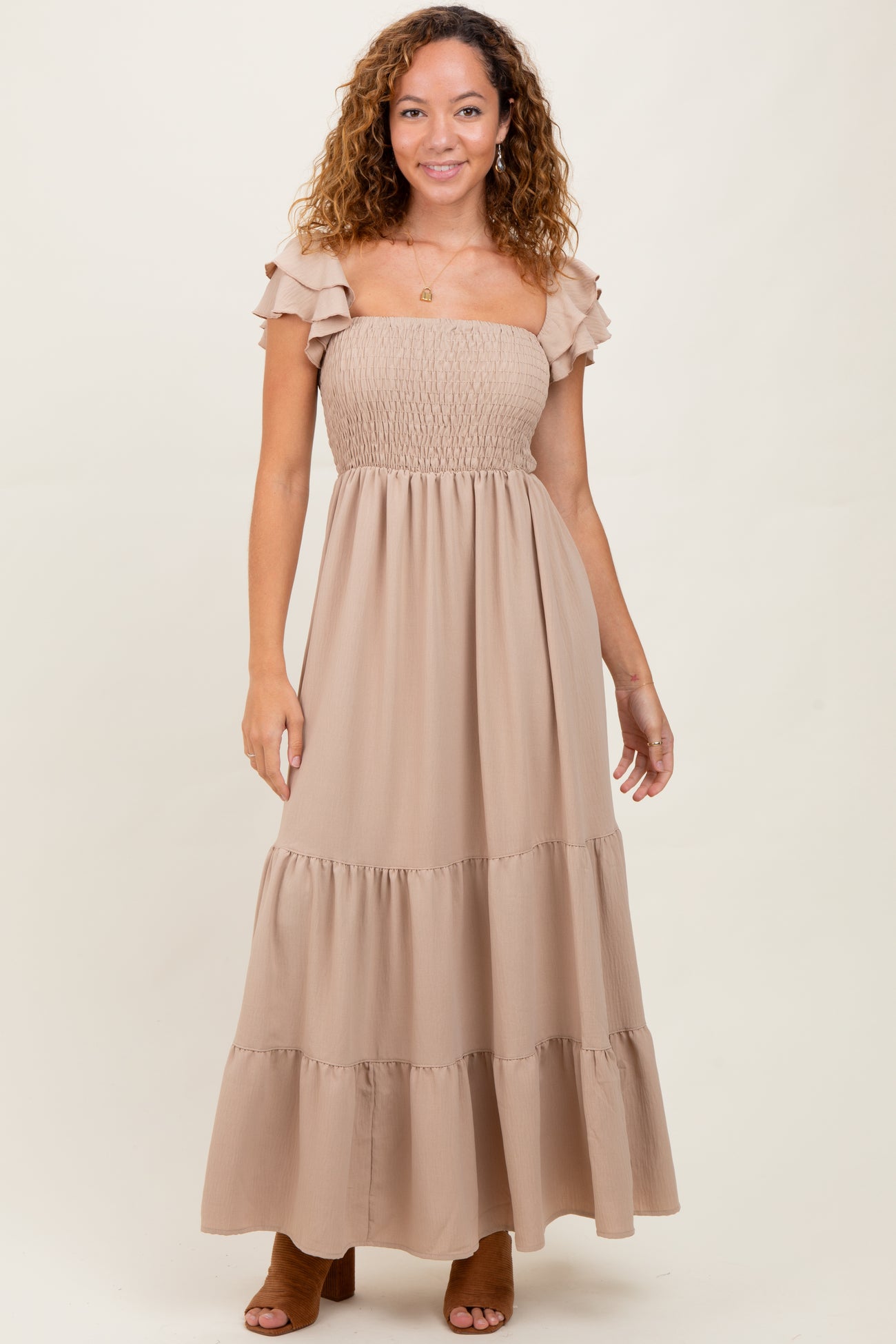 Beige Smocked Ruffle Off Shoulder Tiered Maxi Dress