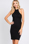 A textured knit fitted maternity dress featuring a halter neckline and fully lined.