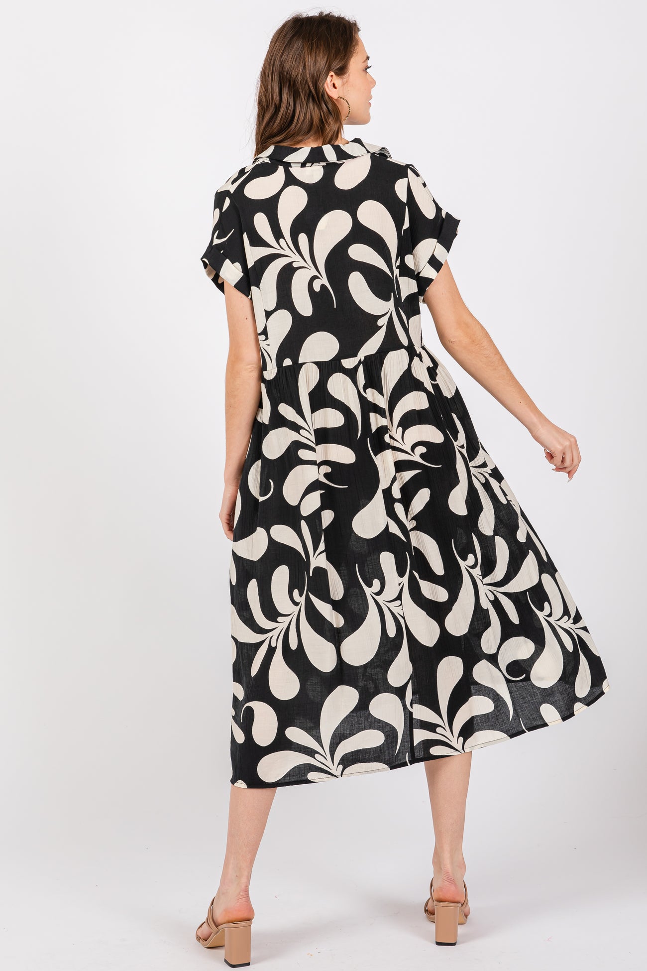 An abstract printed dress with a split v-neckline, a knee-length hem, a collar, short cuffed dolman sleeves, and side pockets.