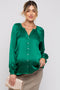 An animal print chiffon maternity blouse featuring long sleeves and a v-neckline. Double lined.