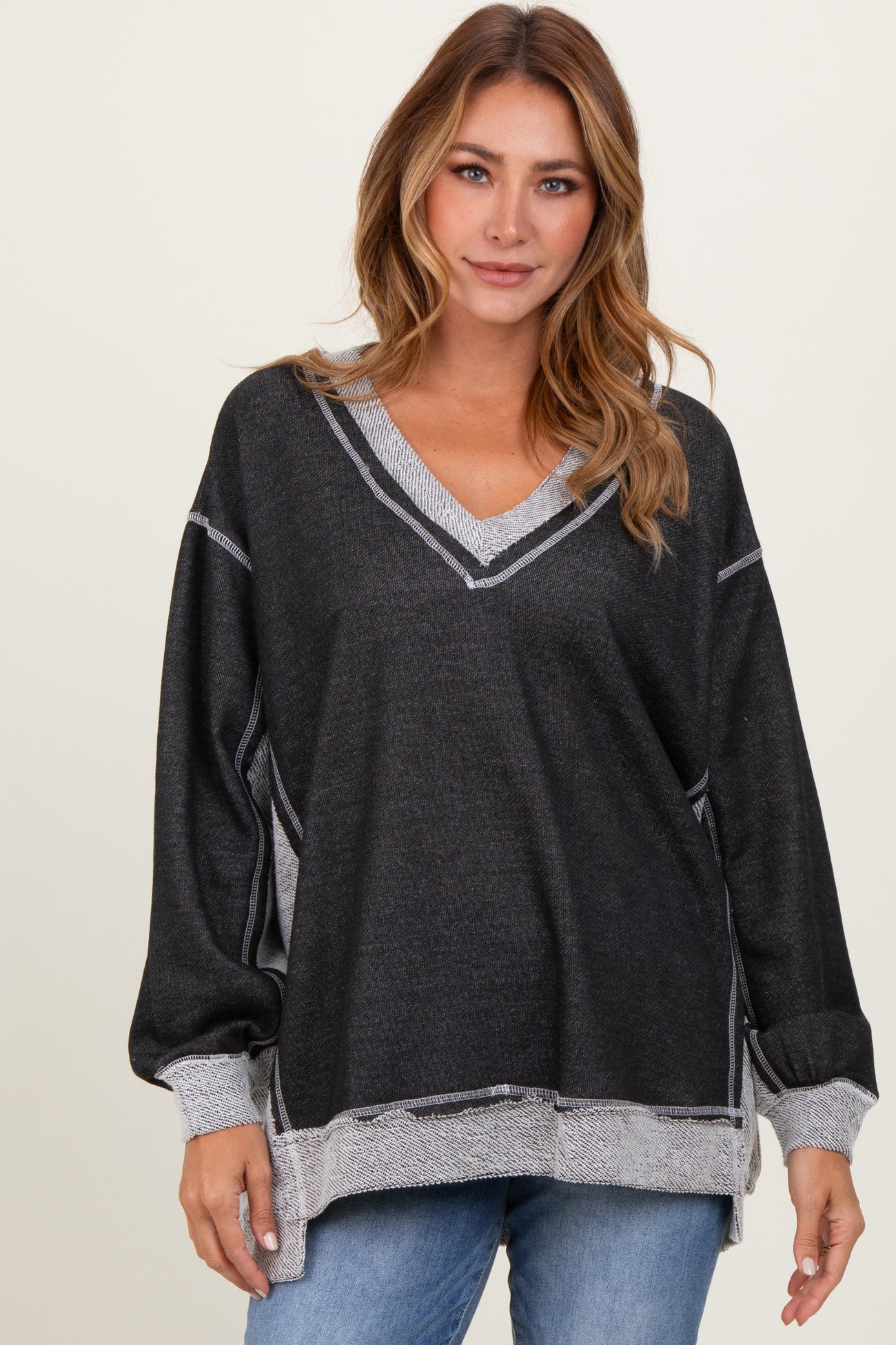 Black Contrast French Terry Long Sleeve Top