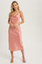 A floral midi dress featuring adjustable straps, a v-neckline, buttons on the top, a tiered skirt, and a back zipper closure. Dress is lined.