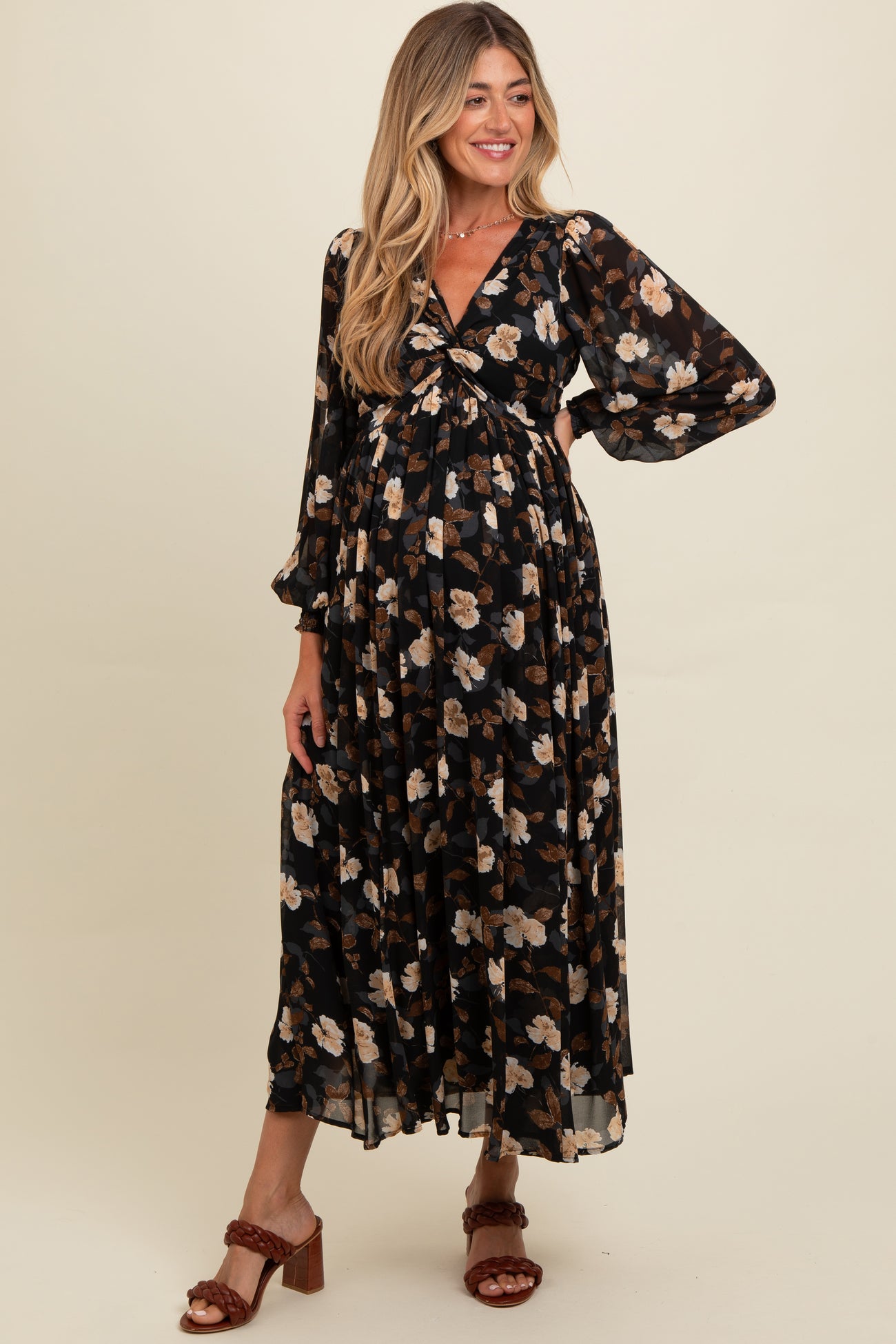 Black Floral Chiffon Twist Front Wrap Maternity Maxi Dress