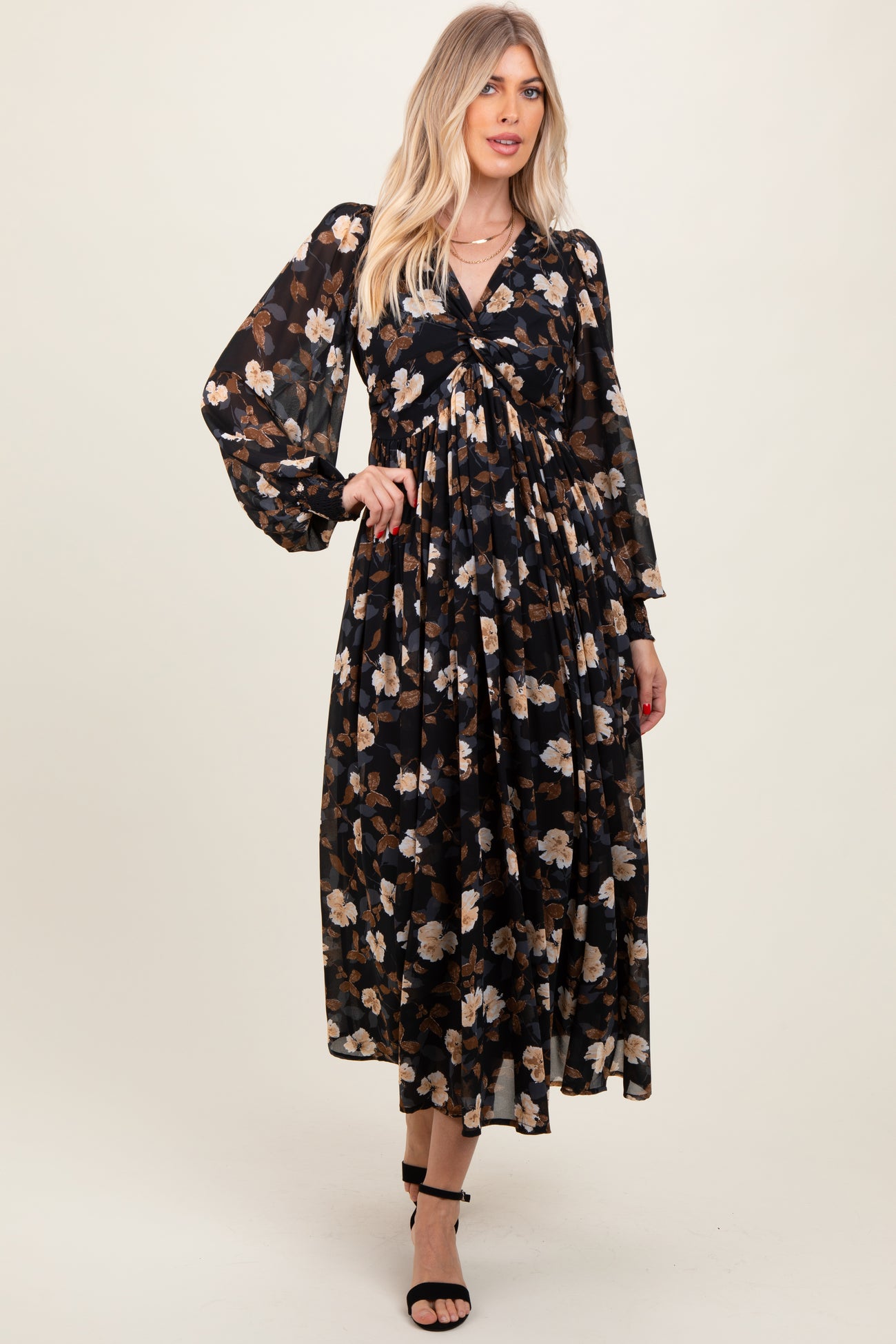 Black Floral Chiffon Twist Front Wrap Maxi Dress