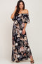 A floral print maxi dress with a flounce elastic off shoulder neckline and elastic waist.
