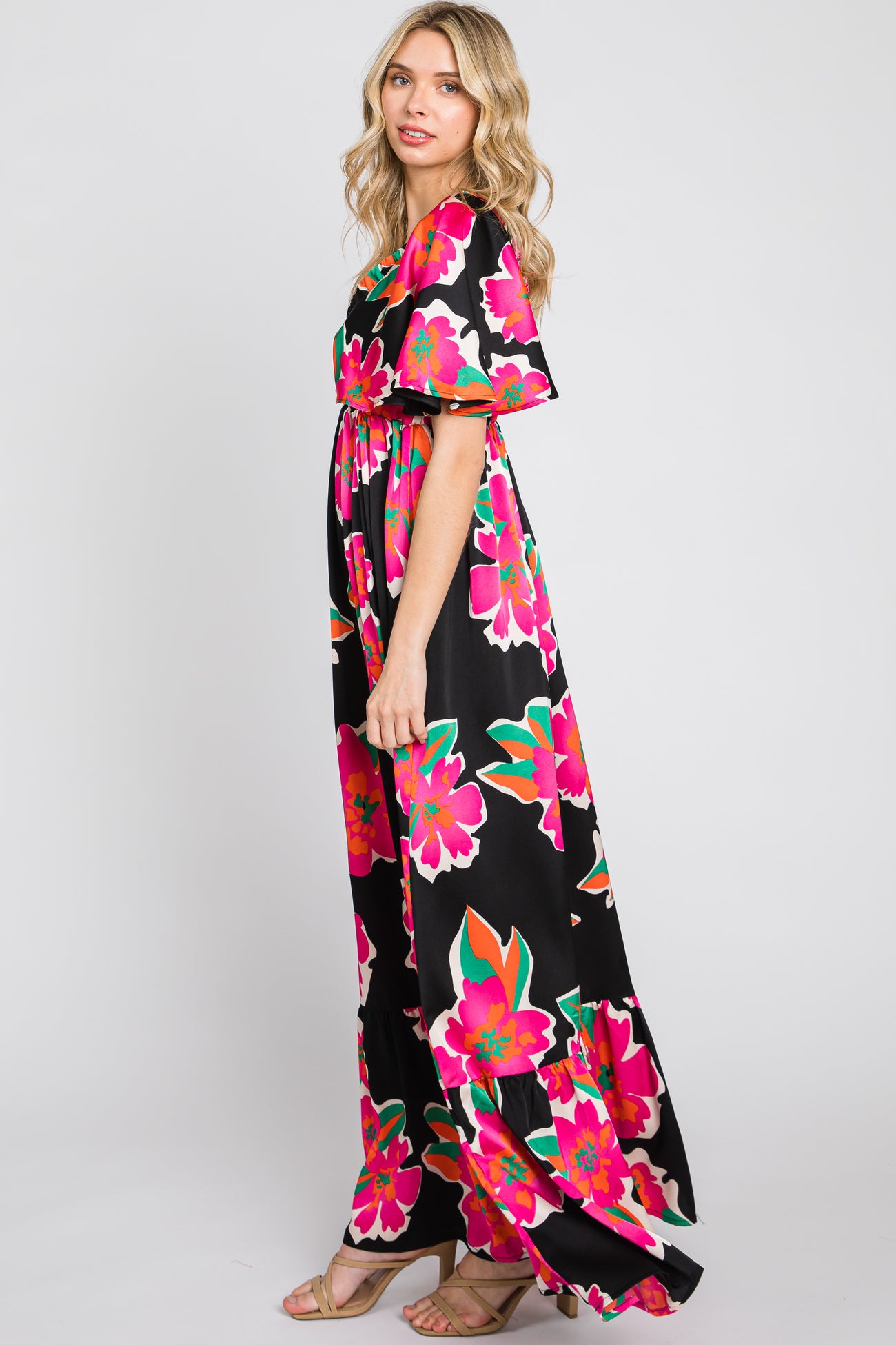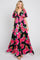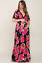 A floral print maxi with a deep v-neckline, short flounce sleeves, an elastic band under the bust, and a fathered bottom hem.
