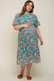A floral midi dress with a squared neckline, a smocked back, long puff sleeves, a ruffle accent under the bust, side pockets, and a gathered bottom tier.