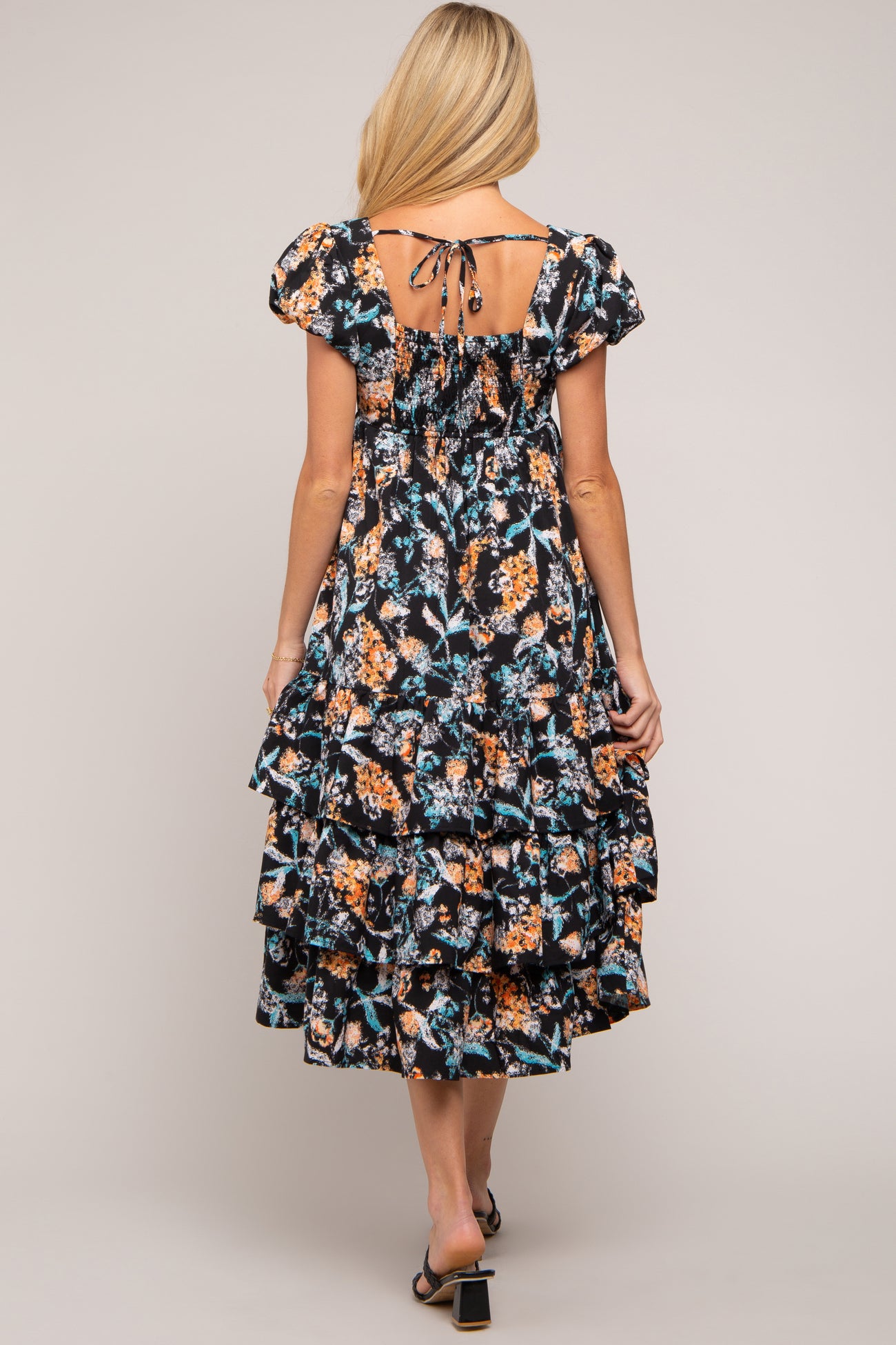 Black Floral Puff Sleeve Tiered Maternity Midi Dress