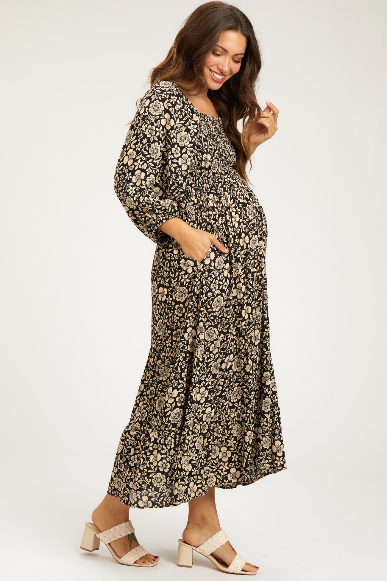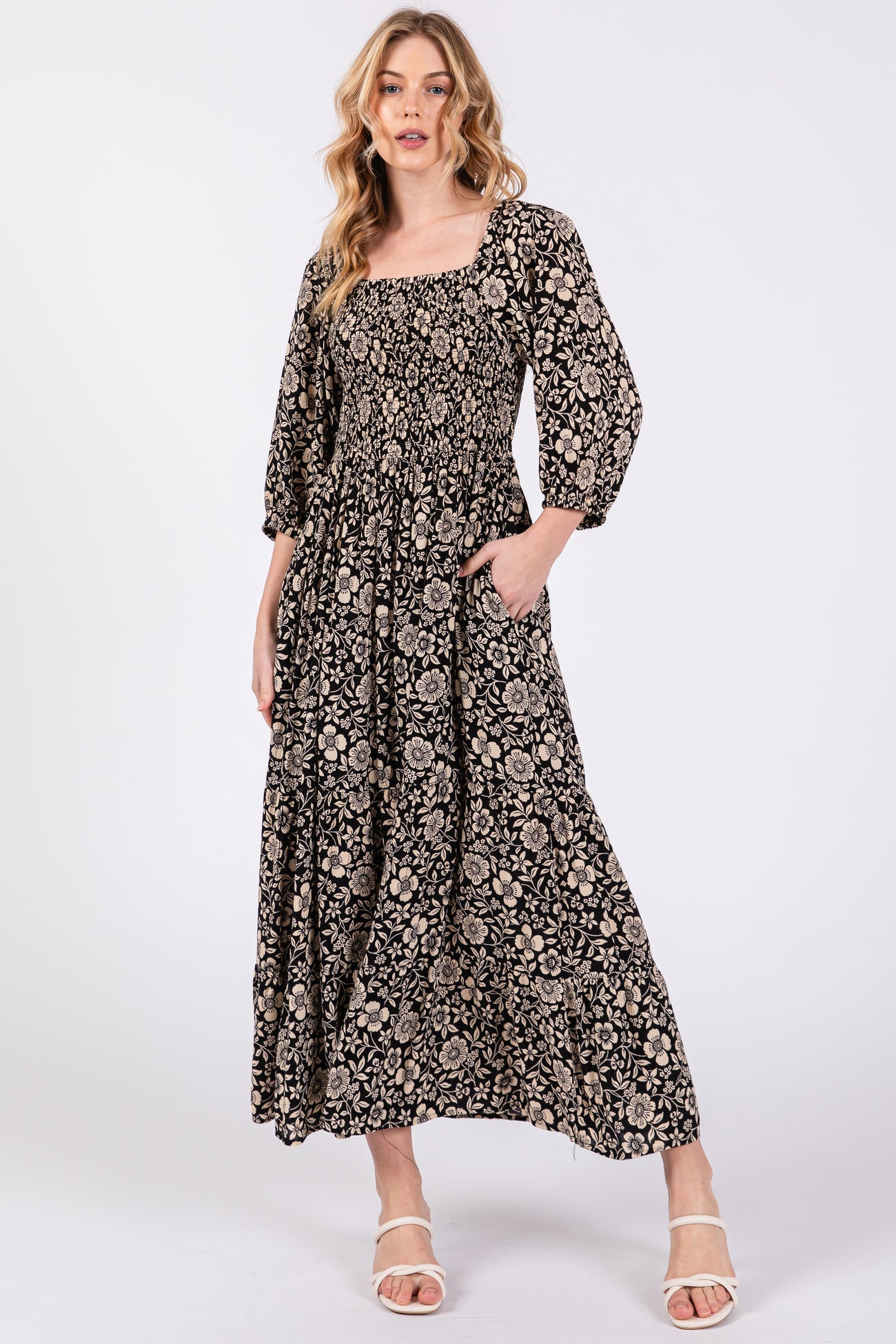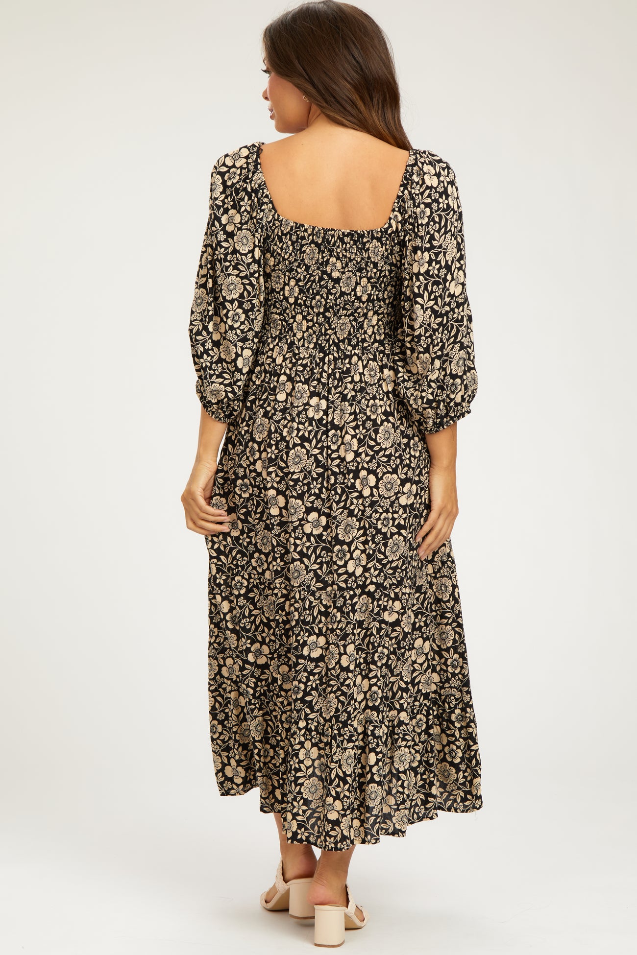 Black Floral Smocked Half Sleeve Maternity Midi Dress