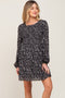 Black floral dress with a rounded neckline, a smocked bodice, long sleeves, and a back keyhole button closure. Skirt is lined.