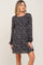 Black floral maternity dress with a rounded neckline, a smocked bodice, long sleeves, and a back keyhole button closure. Skirt is lined.