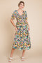 A floral print maternity midi dress featuring a rounded neckline, short puff sleeves with ruffle trim. a smocked bodice and side pockets.