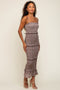A floral maternity midi dress with a straight neckline, adjustable straps, a smocked body, and ruffle accent tiers.