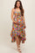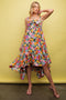 Floral smocked maternity midi dress that includes a square neckline, adjustable ribbon, adjustable straps, and a asymmetrical skirt.