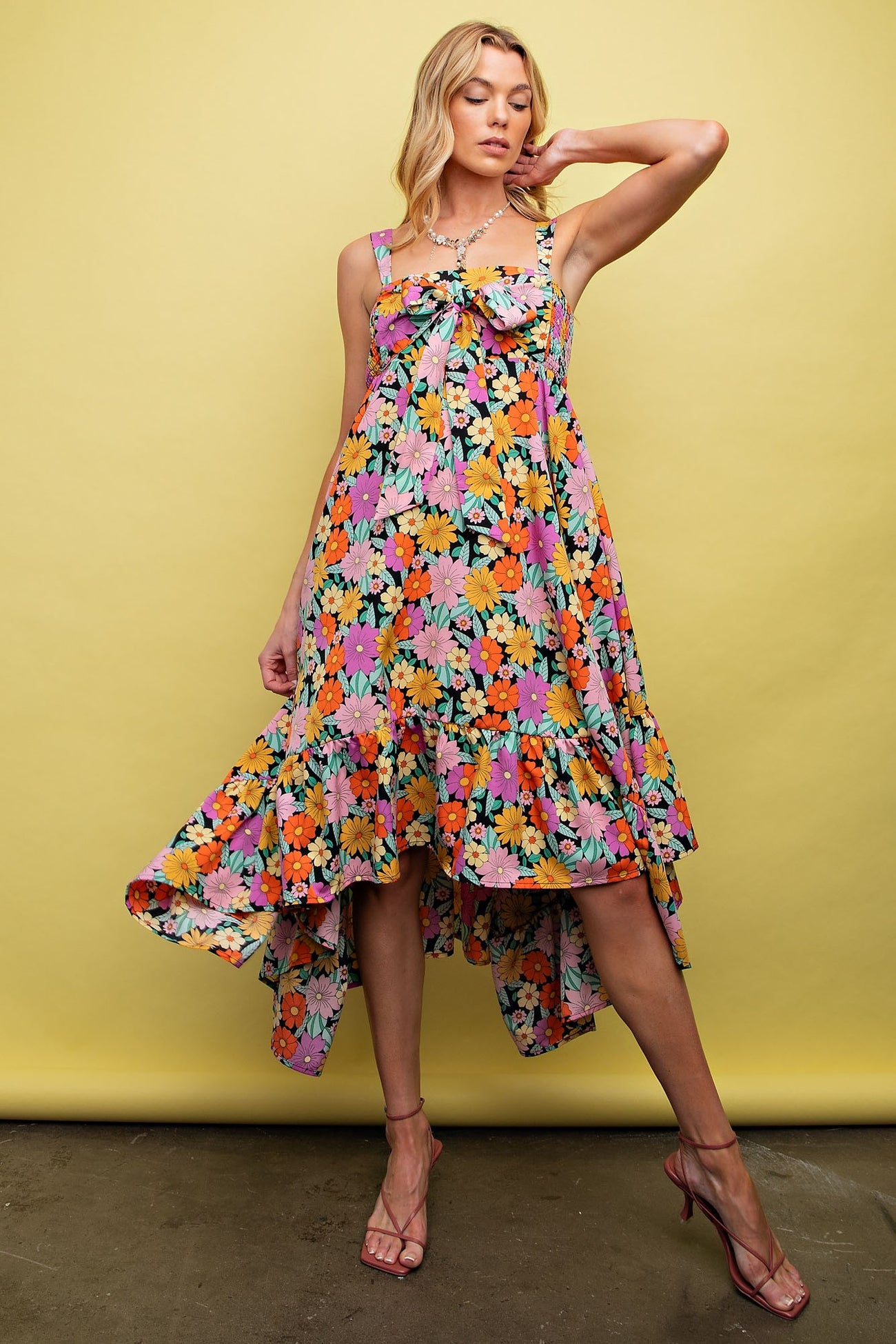 Floral smocked midi dress that includes a square neckline, adjustable ribbon, adjustable straps, and a asymmetrical skirt.