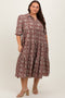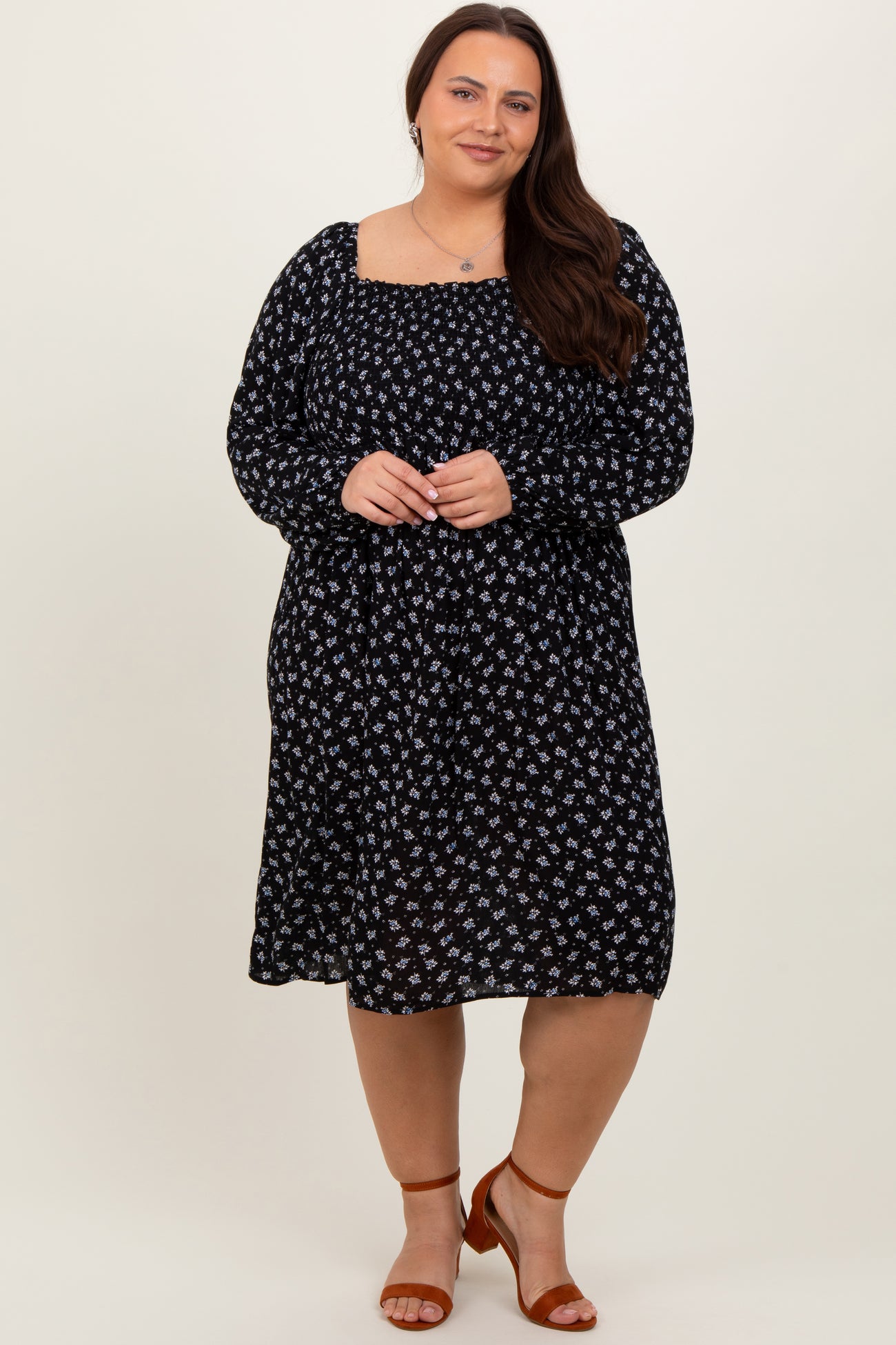 A floral print plus midi dress featuring a square neckline, long puff sleeves and a smocked bodice.