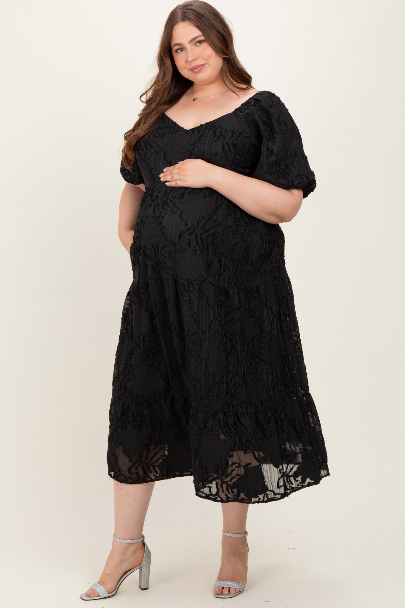 Black Leaf Textured Tiered Maternity Plus Midi Dress