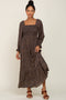A leopard print maternity midi dress featuring a square neckline, a smocked elastic top, long bubble sleeves, a ruffle hem and side pockets.