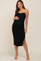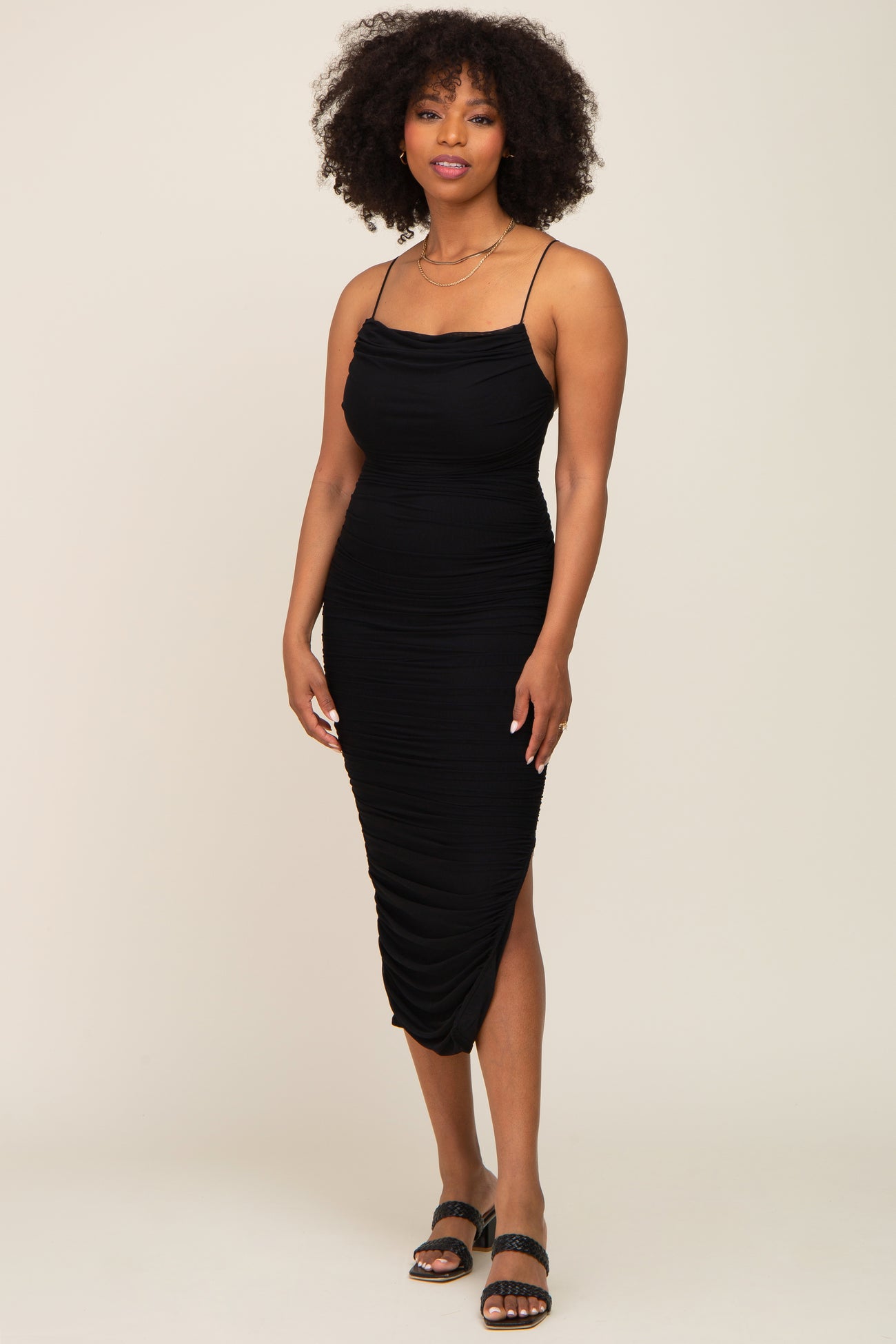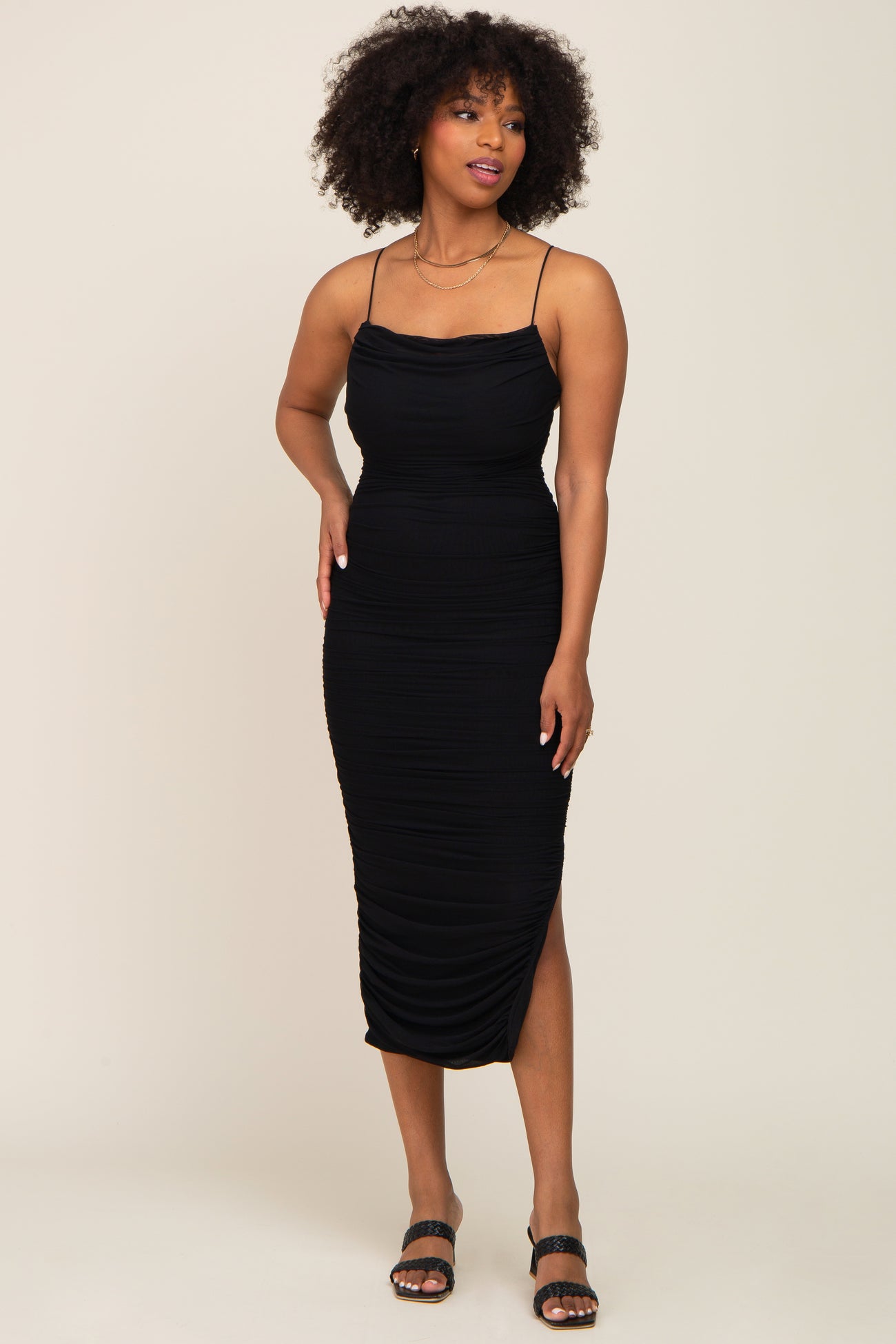 Black Mesh Ruched Cross Back Side Slit Midi Dress