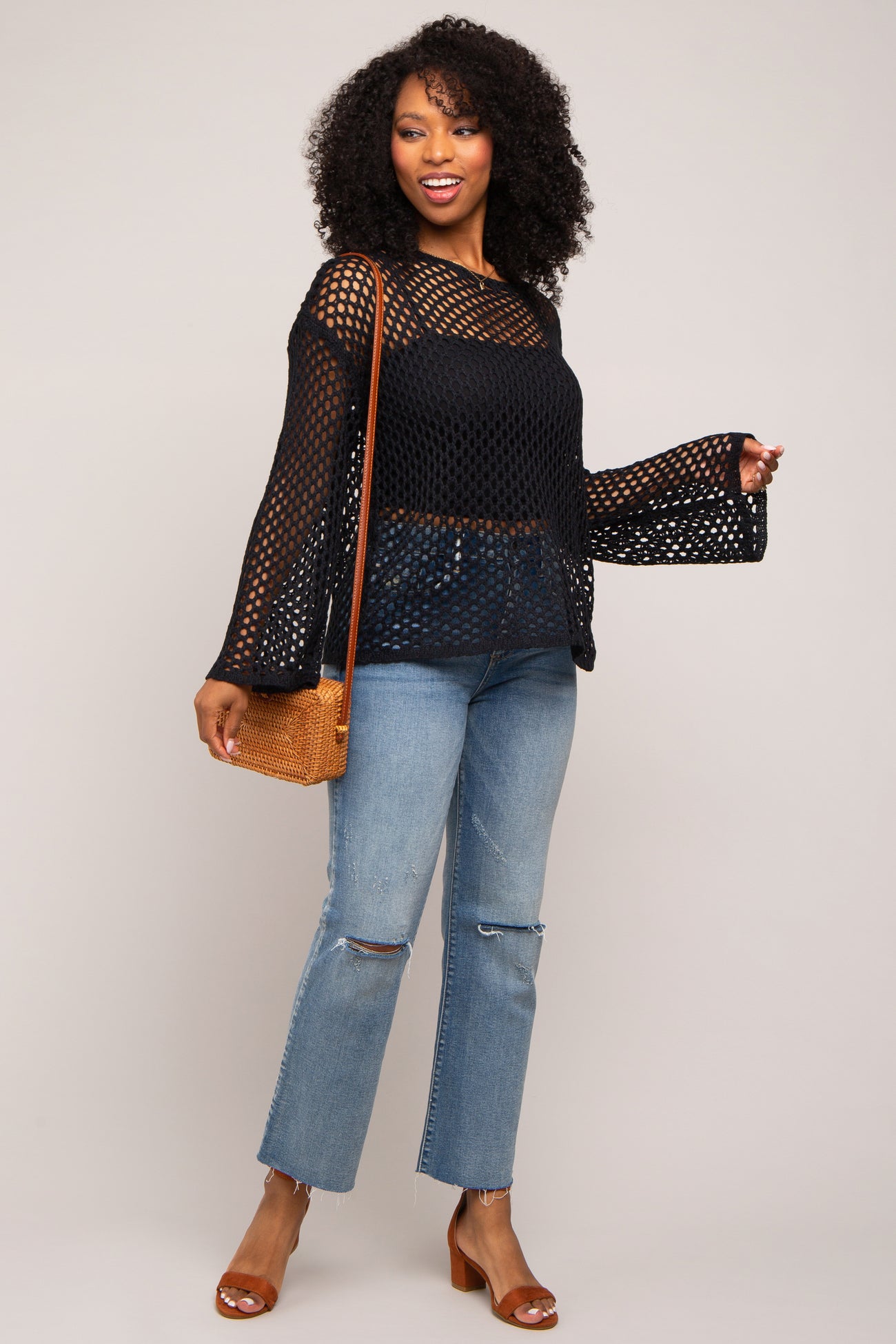 An open knit sweater with a rounded sweater and long bell sleeves.