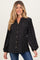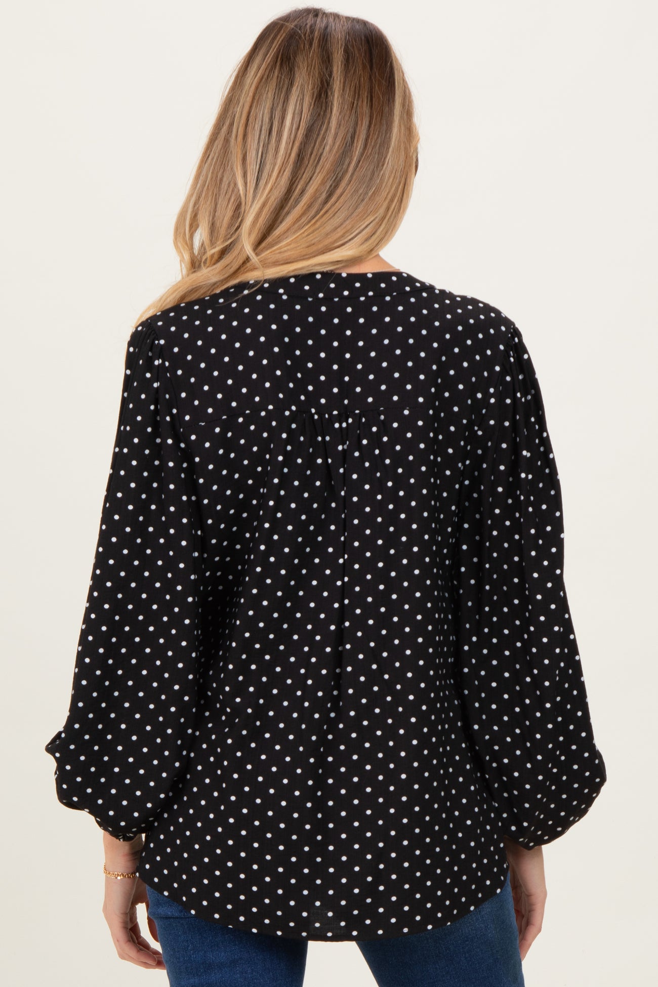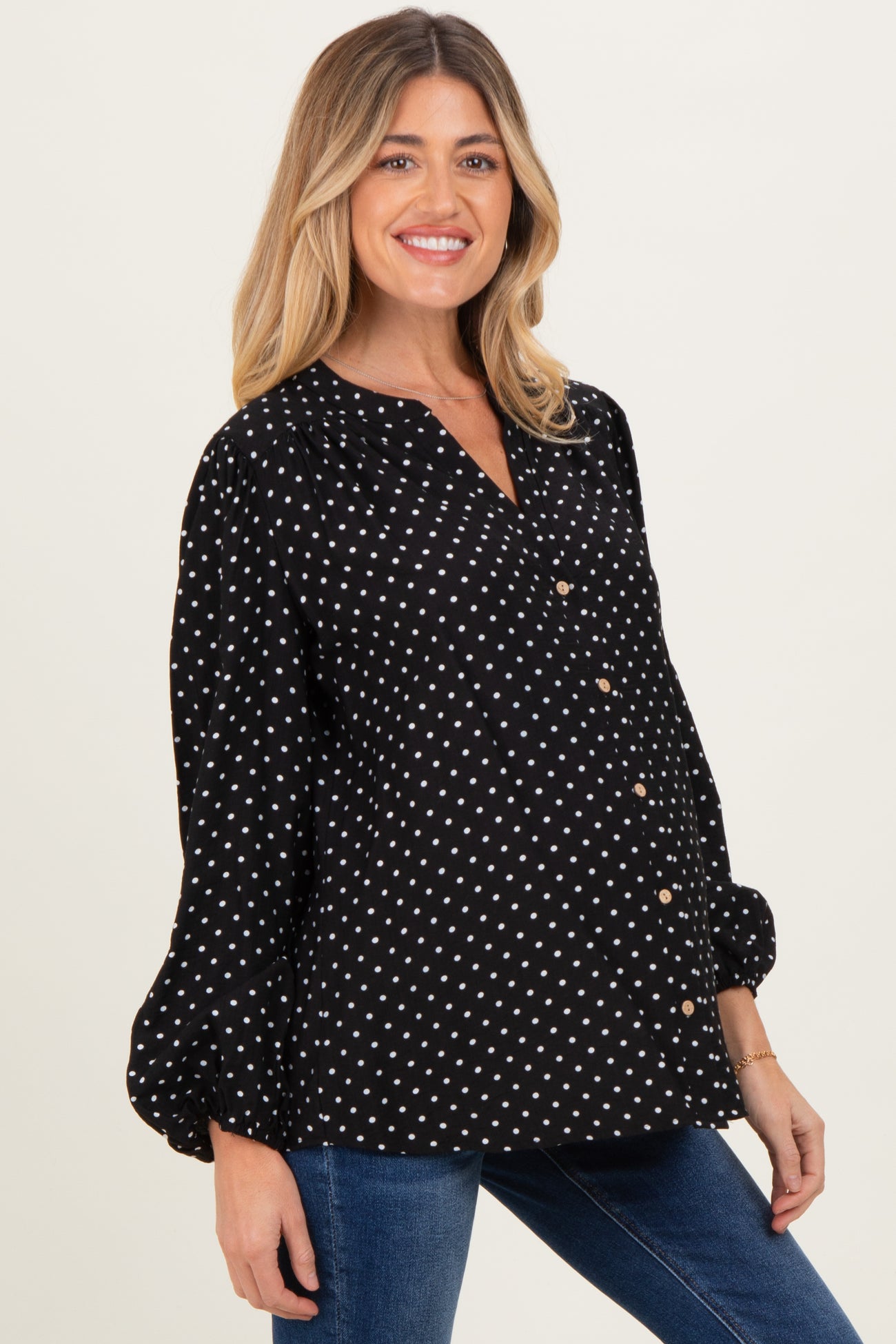 Stay stylish and comfortable throughout your pregnancy with this Black Polka Dot Long Sleeve Button Down V-Neck Maternity Top. Crafted with soft, breathable fabric, this top features a timeless black base adorned with charming white polka dots for a playful yet classic look. The flattering V-neckline and button-down front add versatility, making it easy to dress up or down. Designed with a relaxed fit and gentle gathers to accommodate your growing bump, this top offers both comfort and chic appeal. Perfect for casual outings or workdays, pair it with your favorite maternity jeans and boots for an effortlessly fashionable pregnancy look.