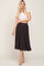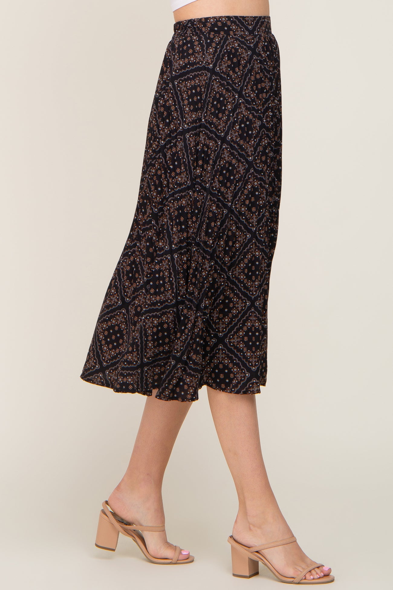 A printed pleated midi skirt with an elastic waistband in back and partial lining.