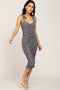 A printed ribbed knit maternity dress featuring a v-neckline, ruched front and sides and adjustable tie straps.