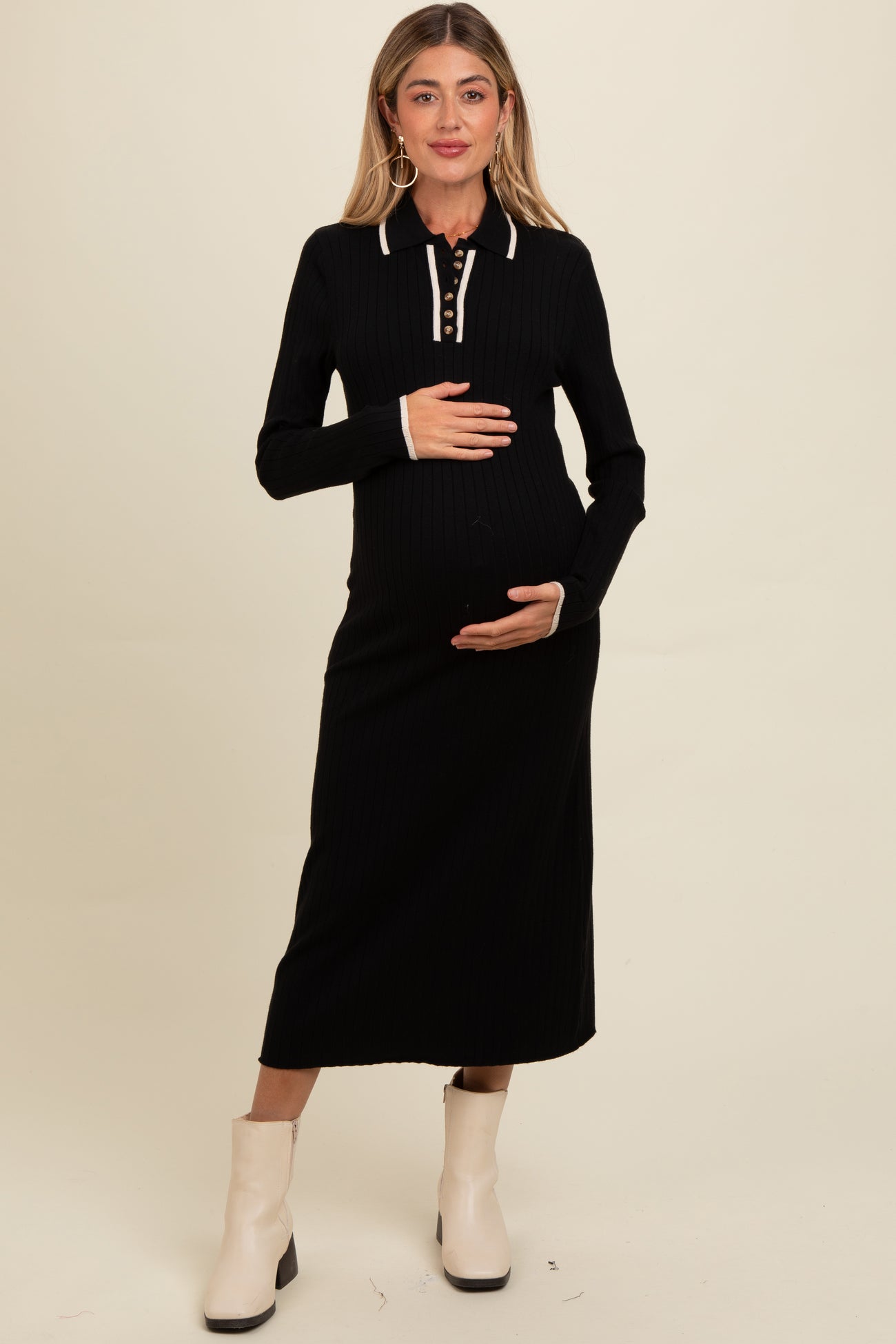 Black Ribbed Contrast Trim Polo Maternity Midi Sweater Dress