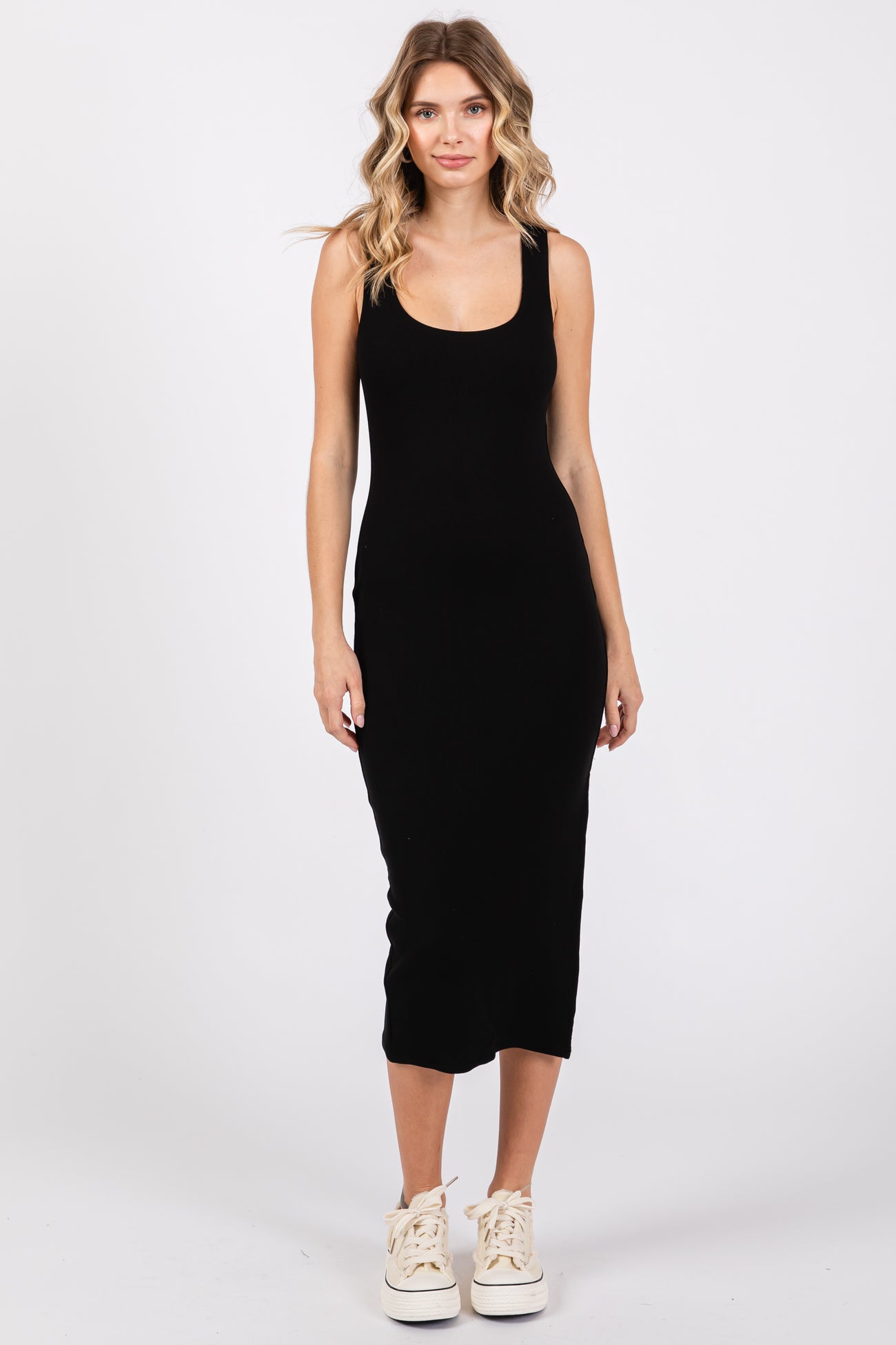 Black Ribbed Knit Sleeveless Side Slit Dress