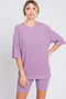 A heathered ribbed set. Top features long sleeves and a rounded neckline. Fitted shorts.