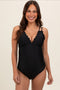 Black Ribbed Wrap Front Drawstring Side One-Piece Swimsuit