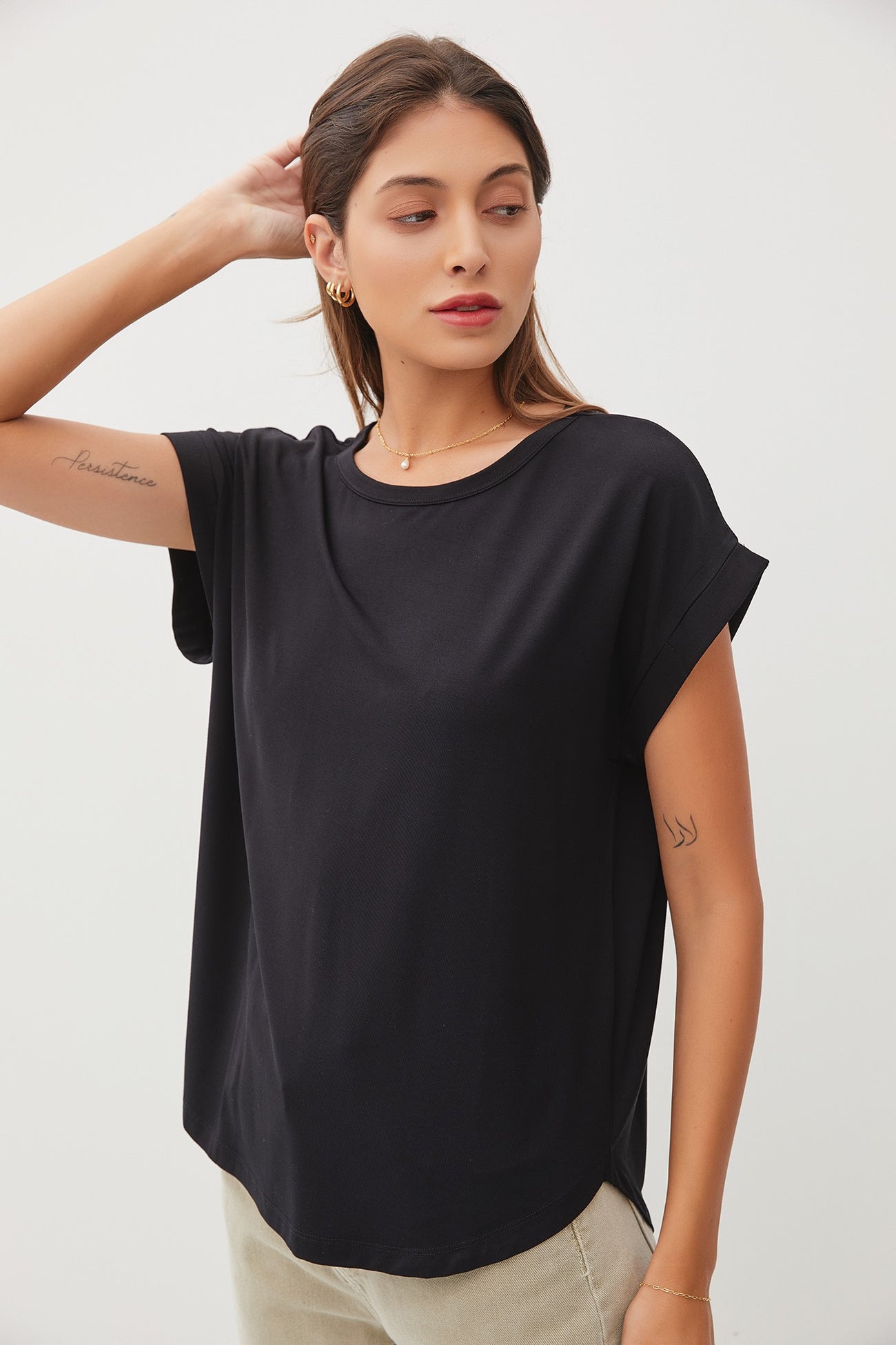 A solid short sleeve top with rolled cuff short sleeves and rounded hem.