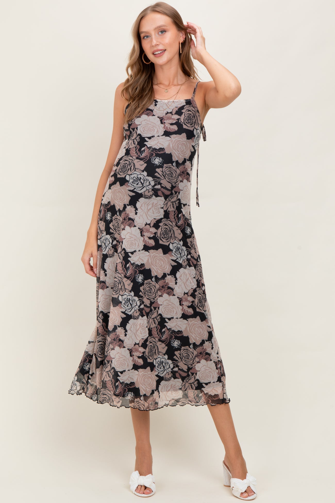 Elevate your maternity wardrobe with our Black Rose Print Mesh Sleeveless Maternity Midi Dress. Featuring a delicate rose pattern on a sheer mesh overlay, this dress is designed to flatter your growing bump while keeping you stylish and comfortable. The sleeveless cut and adjustable shoulder ties provide a perfect fit, while the midi length adds an elegant touch. Lightweight and breathable, it’s ideal for special occasions or everyday wear. Pair it with your favorite sandals or heels for a chic, effortless look throughout your pregnancy journey. Stay trendy and radiant with this must-have maternity dress!