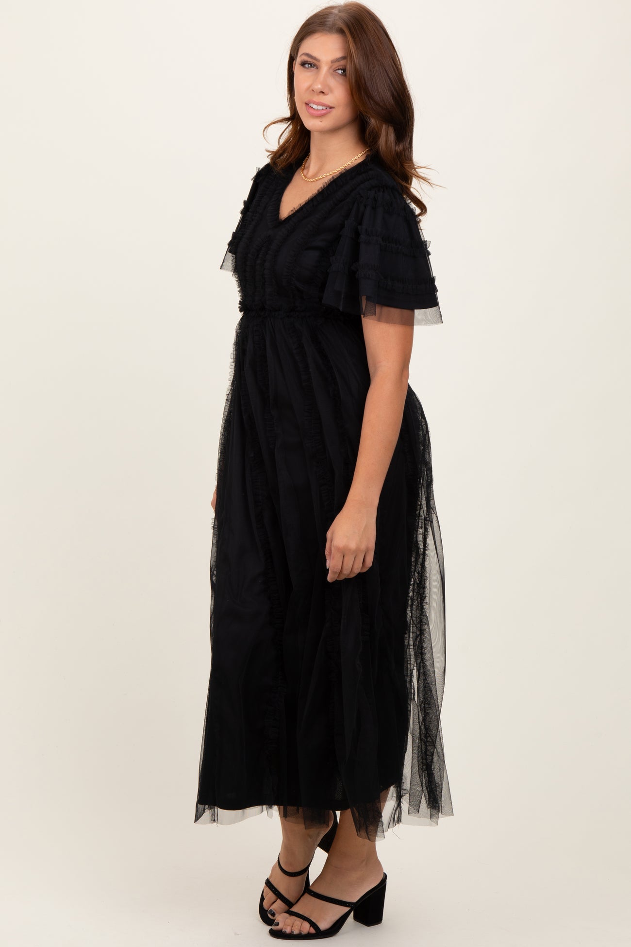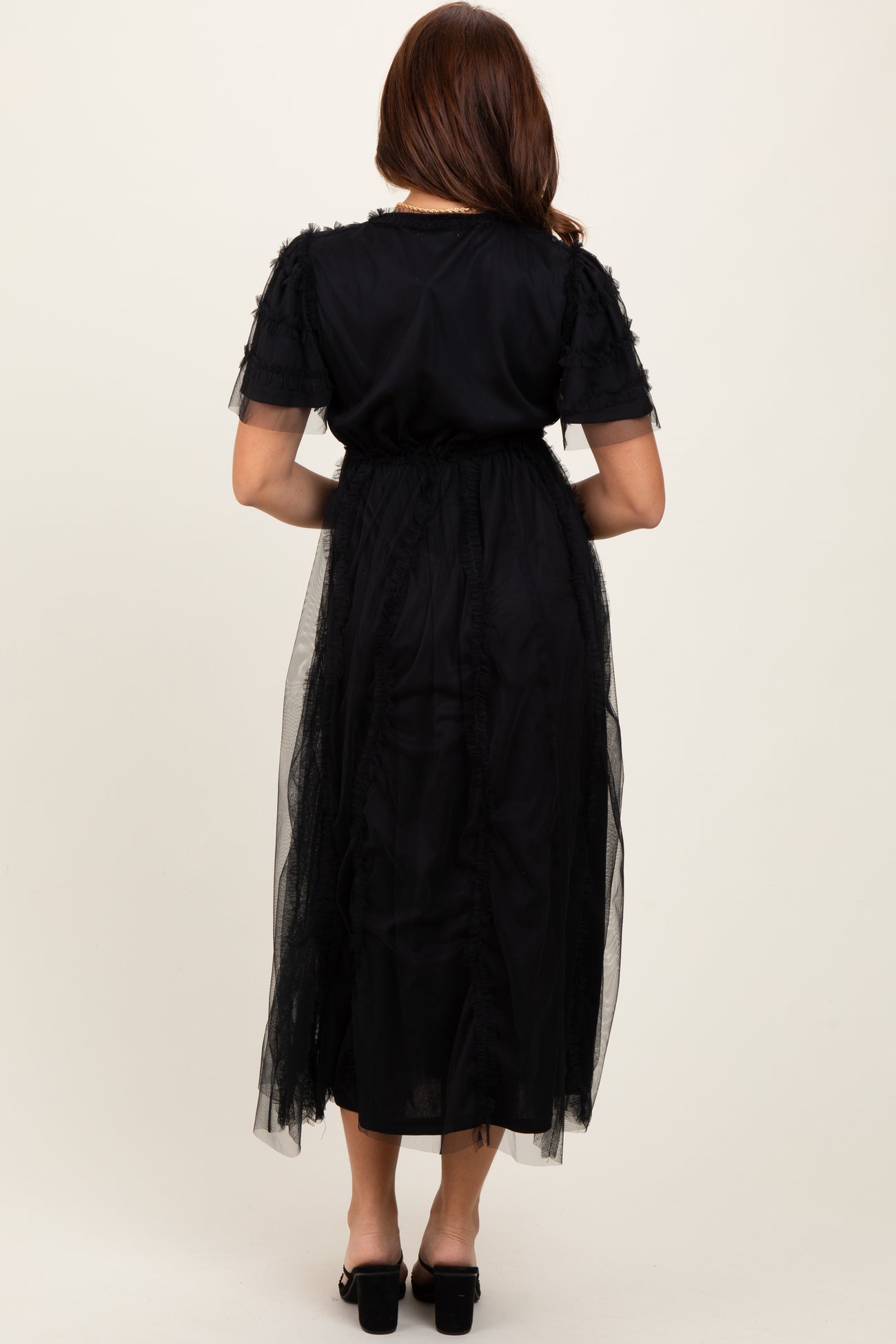 Black Ruffle Accent Mesh Overlay Maxi Dress