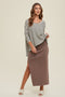 A solid hued maternity dress featuring short puff sleeves, a tiered skirt, side pockets and a ruffle v-neckline.