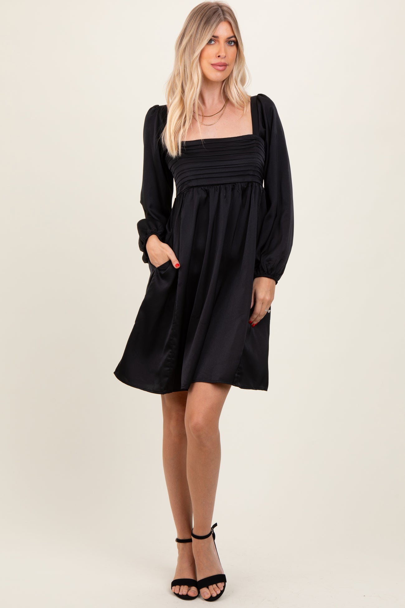 Step out in timeless elegance with our Black Satin Pleated Detail Bodice Dress. Crafted from luxurious satin fabric, this dress features a flattering square neckline with delicate pleated detailing across the bodice for a chic, structured look. The long, billowy sleeves add a romantic touch, softly cinched at the wrists to create a graceful silhouette. Falling into a flirty A-line skirt, this dress offers both comfort and style for any occasion, from cocktail parties to evening affairs. Pair it with your favorite heels and understated jewelry for a stunning, sophisticated ensemble. Available in multiple sizes.