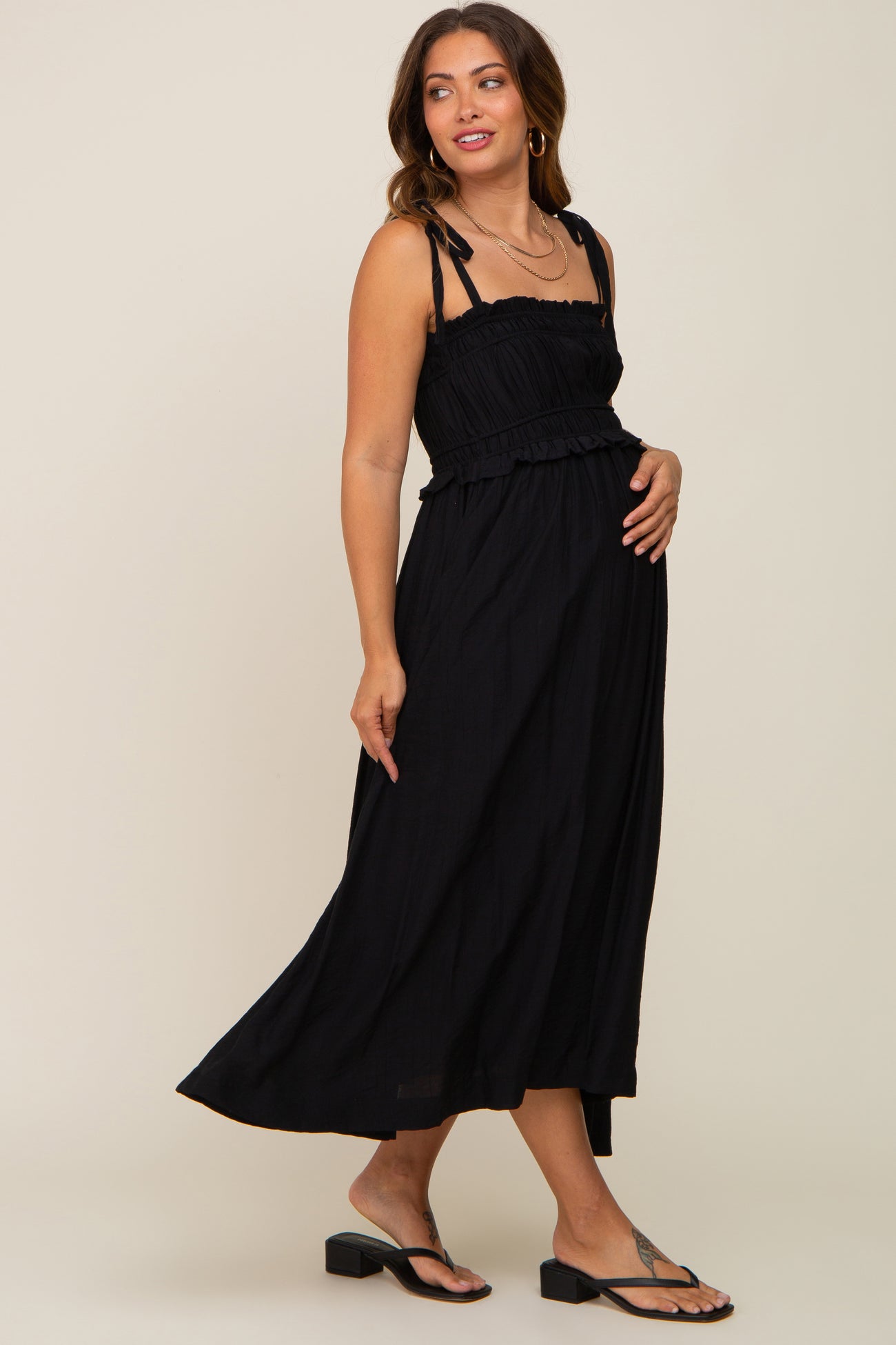 Black Shirred Shoulder Tie Maternity Midi Dress