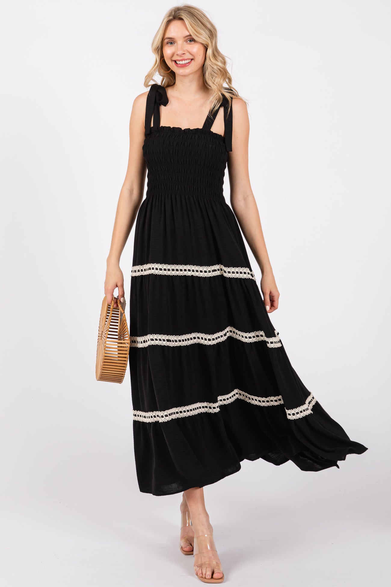 Elevate your wardrobe with this Black Smocked Maxi Dress, the perfect blend of comfort and style. Featuring a smocked bodice for a flattering, snug fit and adjustable tie shoulder straps, this dress offers a customizable feel. The flowy maxi skirt is beautifully accented with delicate white crochet lace bands, adding a touch of boho charm to the classic black fabric. Lightweight and breathable, it's ideal for warm days or evening outings. Pair it with sandals for a casual look or dress it up with heels and statement accessories for a chic, effortless vibe. Step out in style and confidence with this timeless maxi dress.