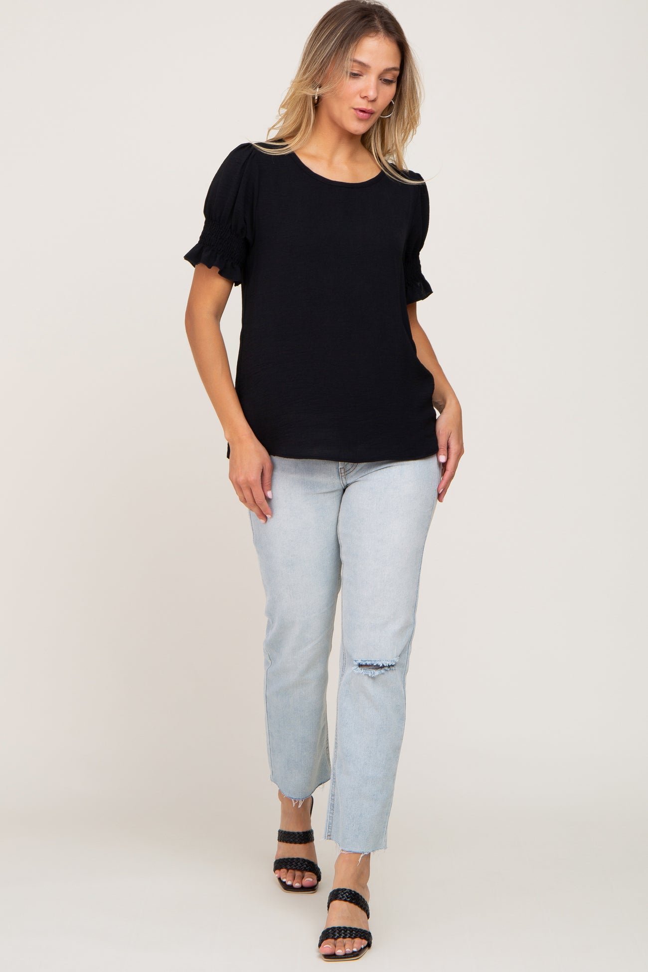 A basic blouse with a rounded neckline and smocked puff sleeves.