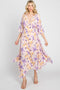 A solid hued maternity dress featuring short puff sleeves, a smocked top, ruffle accents and a ruffled square neckline. Skirt is double lined.