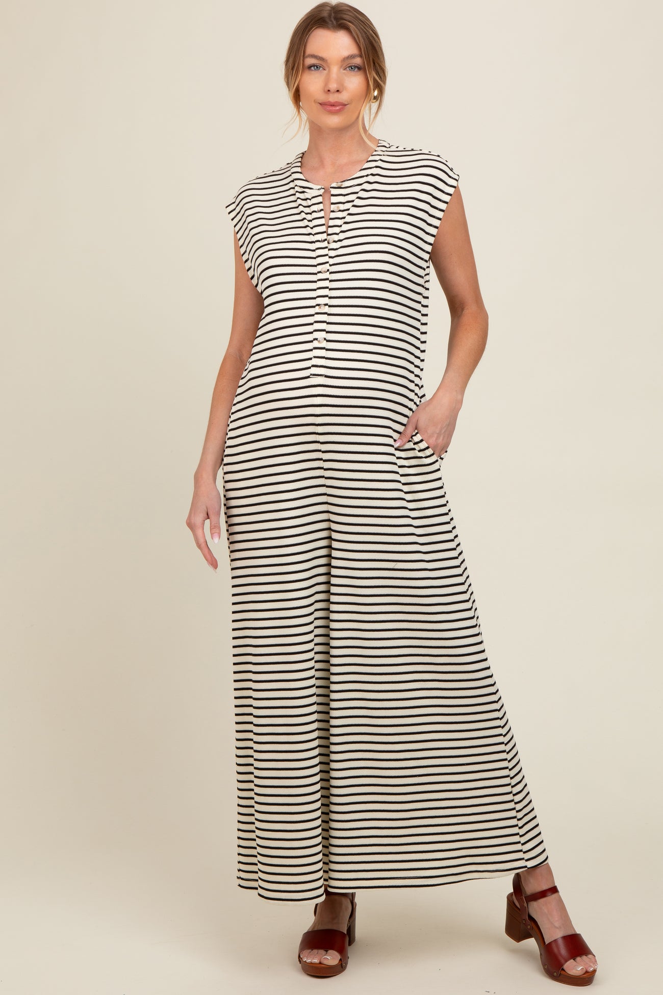 Black Striped Button Up Wide Leg Maternity Jumpsuit