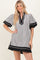 Step out in style with our Black Striped Contrast Border Mini Dress. Featuring vertical black stripes on a crisp white base, this dress is designed with a chic contrast border along the neckline, sleeves, and hem for a modern twist. The relaxed fit and puffed short sleeves offer both comfort and a flirty silhouette, making it perfect for daytime outings or casual evenings. Pair it with sneakers for a laid-back look or dress it up with heels for a night out. Made from lightweight, breathable fabric, this mini dress is your go-to piece for effortless, trendy fashion all season long.