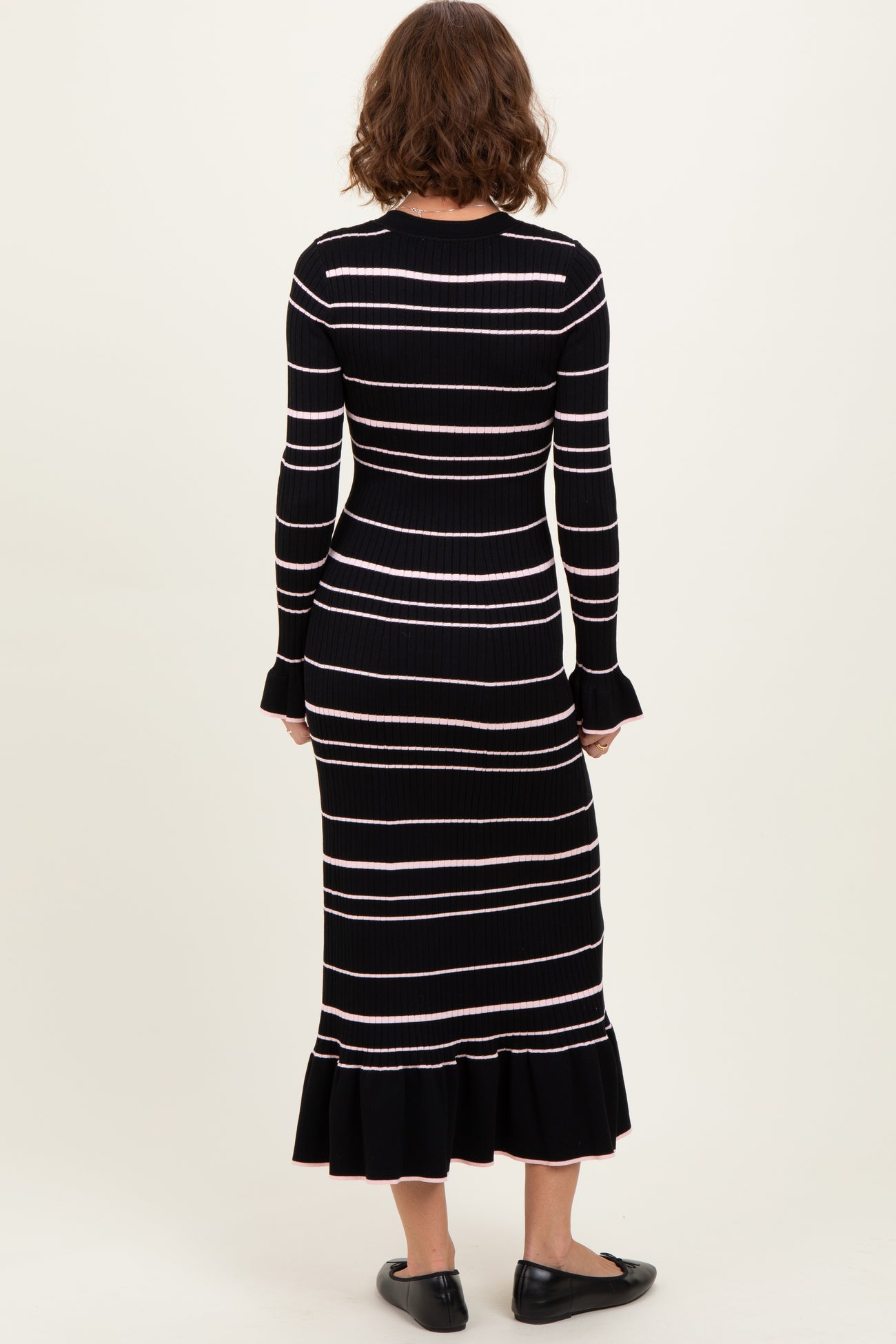 Black Striped Knit Ruffle Hem Button Down Midi Dress