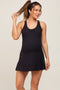 A soft knit tennis romper dress. Features a scoop neckline, a racerback with a cutout, removable cups, an elastic band under the bust, and side pockets on the shorts.